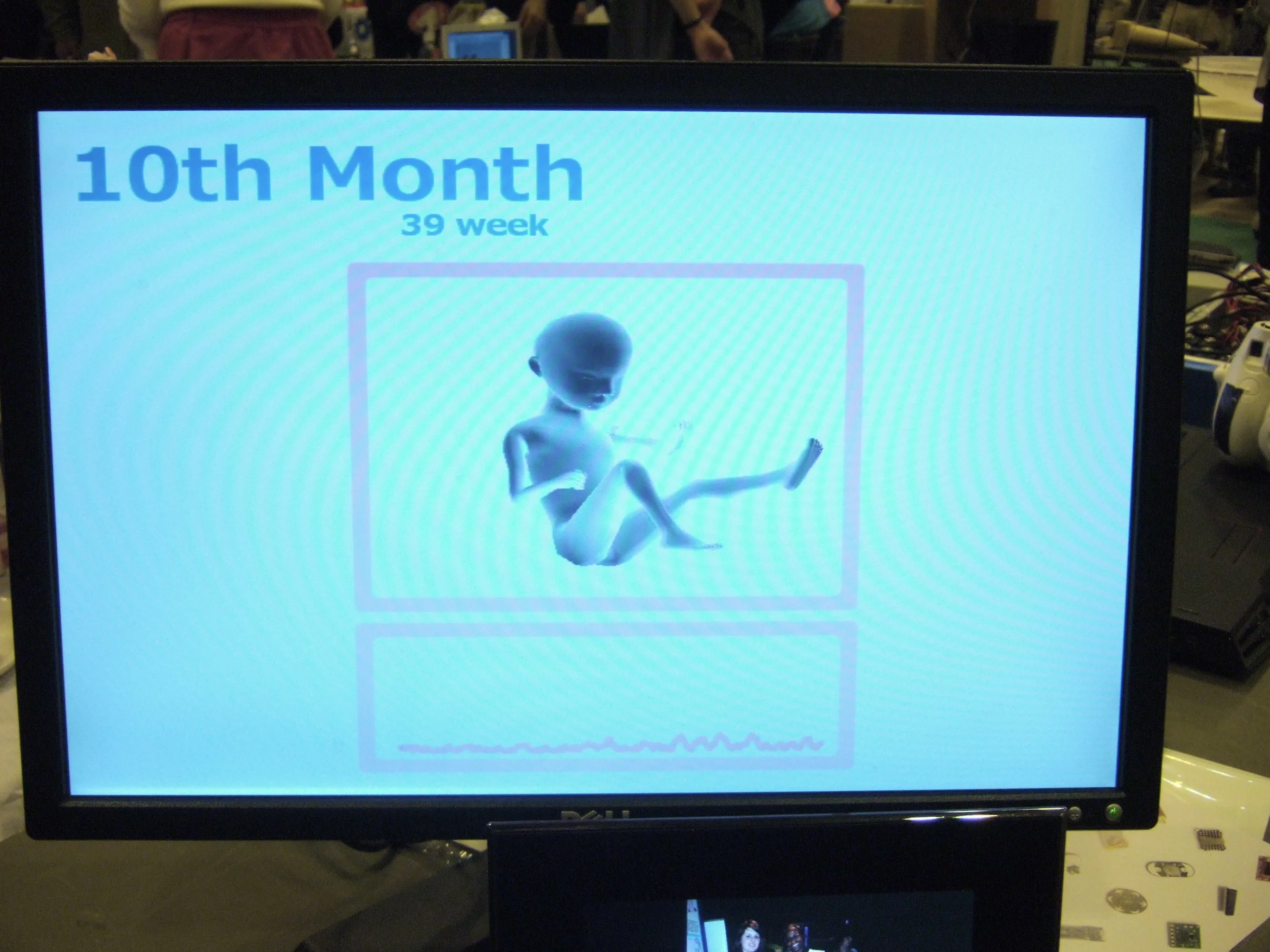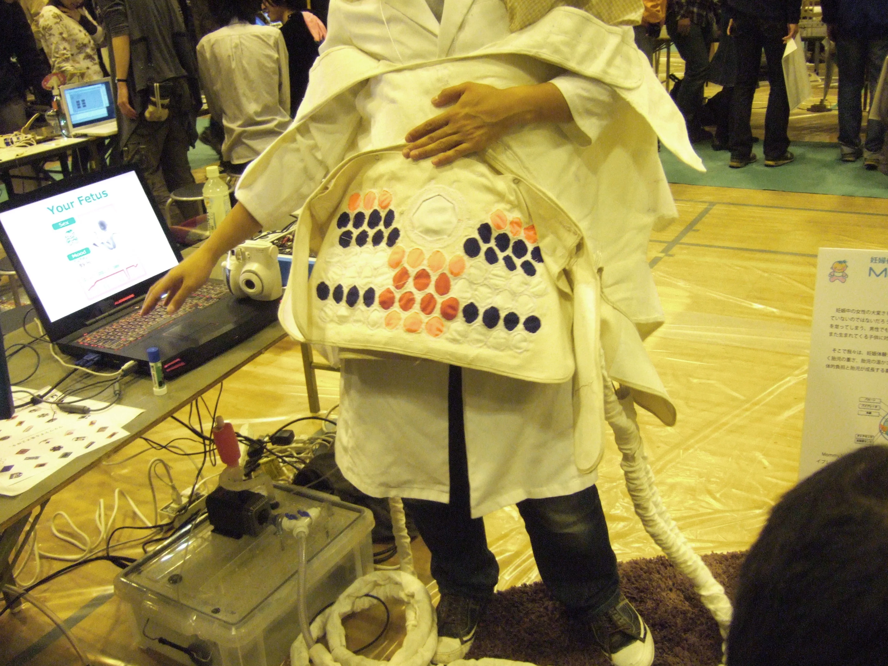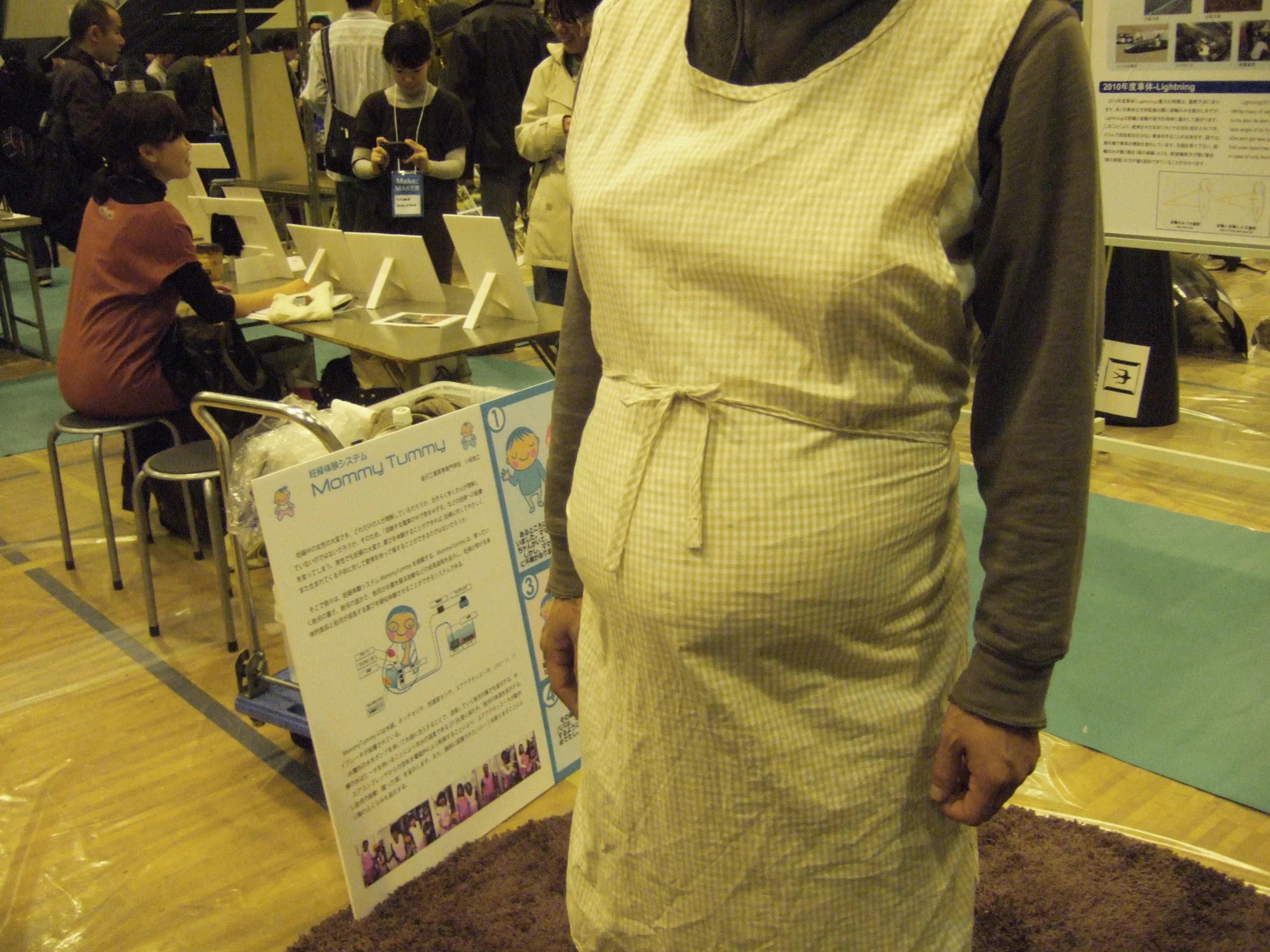One of the more popular exhibits at Tokyo Make Meeting this past weekend was Mommy Tummy, a pregnancy experience simulation system developed by Kosaka Laboratory of Kanazawa Technical College. It allows men (and others who have never carried a child) to not just feel what it's like to be pregnant, but to also gradually experience the changes. The Mommy Tummy suit is pumped full of water, and the onscreen display updates you as to how far along your pregnancy has progressed. The man's breasts will get bigger as well – did I just write that? – via a pair of inflatable balloons on the front.