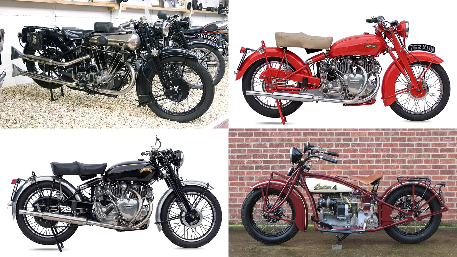 For those seeking less exotic but more traditional high-value steeds, there's also (clockwise from top left in above image) a 1927 Brough Superior 680 ($170,000 to $200,000), a 1950 Vincent Rapide Series C ($85,000 to $105,000), a 1931 Indian 402 ($70,000 to $85,000), and a 1954 Vincent Rapide Series C ($55,000 to $70,000).