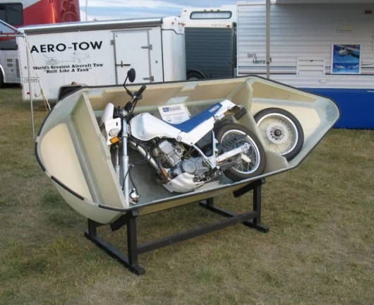 AVWeb has some additional info on the kit, which has been tested on a four-seat Van's Aircraft RV-10 kitbuilt experimental aircraft and the additional frontal area and drag and 230 kg weight cut roughly 9 knots from the airspeed. The pods are aimed at aircraft such as the Cirrus SR22, Cessna 182 and similar-sized models and locks in place with a pin system. Extracting the motorcycle is done via a winch which lowers the pod to the ground – from there you need to unfold the handlebars and your ground transport is ready to go.