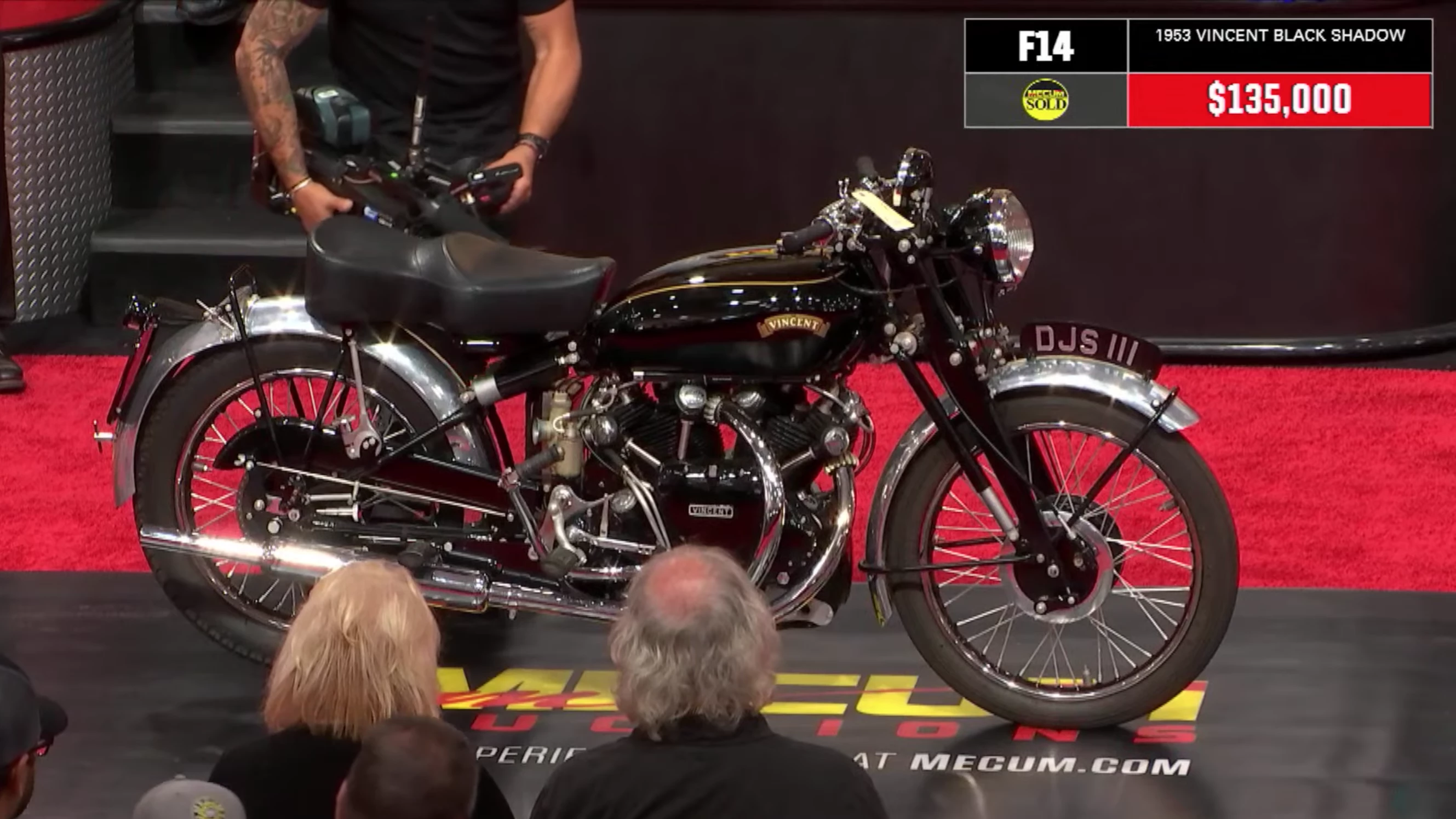 This 1953 Vincent Black Shadow went to auction during Monterey Car Week with Mecum Auctions (Lot F14) on 13-August-2021 with an official estimate of $150,000 to $175,000. The bike sold for a hammer price of $135,000, which equates to a total price of $148,500 including buyers premium (Mecum)