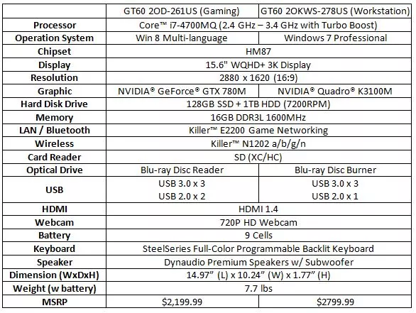 For users who like the look of the GT60's specs, but are not particularly taken by the game-oriented setup, MSI has also launched a workstation version of the notebook. The GT60 2OKWS-278US is almost identical to its Series sibling, but runs Windows 7 Professional and has been optimized for applications like Adobe's Creative Suite 6, AutoDesk, and SolidWorks.