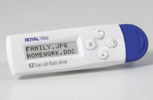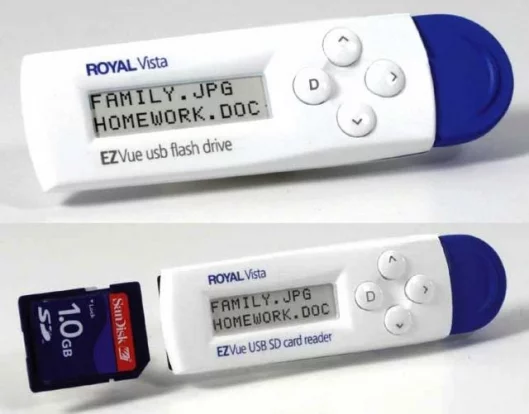 March 28, 2006 More innovative thought is being focussed on the flash drive than we thought possible, because every week or so, we seem to run another story about an important new design feature incorporated into a flash drive. This week it’s a USB 2.0 Flash/Jump drive with a scrollable window display enabling consumers to view stored file names without a computer connection. The Royal EZVue Vista Drive will be available in of 256MB (US$50), 512MB (US$80) and 1GB (US$100) memory sizes plus there’s what we think will be a killer app – a US$30 SD Card Reader/Writer with the same scrolling display, offering a wide-range of really useful applications including digital photography and music storage. On-the-go consumers can now easily find the files they want in a muddle of SD cards.