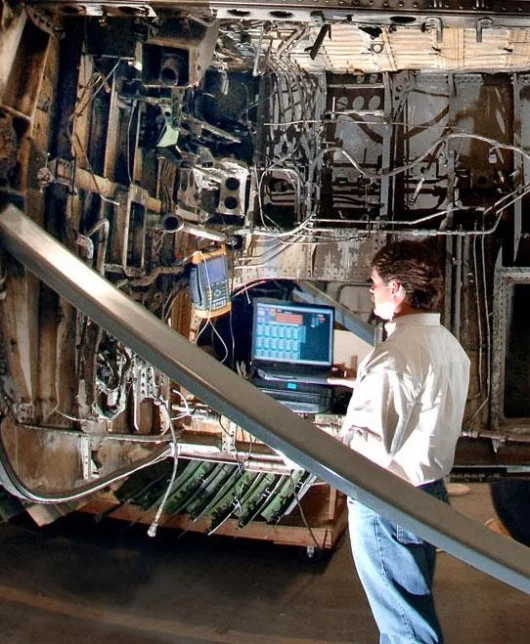 Because the voltage is higher than that normally used in airplanes, the electrical pulse will jump like a rabbit from the smallest wiring insulation fault (which to ordinary instrumentation seems undamaged) either to the bulkhead or to another nearby damaged wire. That spark — like static electricity leaping from hand to doorknob — in effect lights up the invisibly damaged spot like a tracer bullet at night lights up a target. The amount of time it takes for the current to return to its source is analyzed by the automated test-set to tell within inches how far the break is from the test entry point.