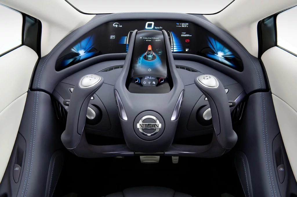 The vehicle's two-seater tandem layout is enveloped in what seems like the canopy of a glider, while its unique "tilt" setup employs a special leaning function that holds occupants firmly in place even when the vehicle is cornering at angles. In developing the Land Glider, Nissan designers have created a two-seater that offers the sense of security of a cocoon, but delivers real driving pleasure.