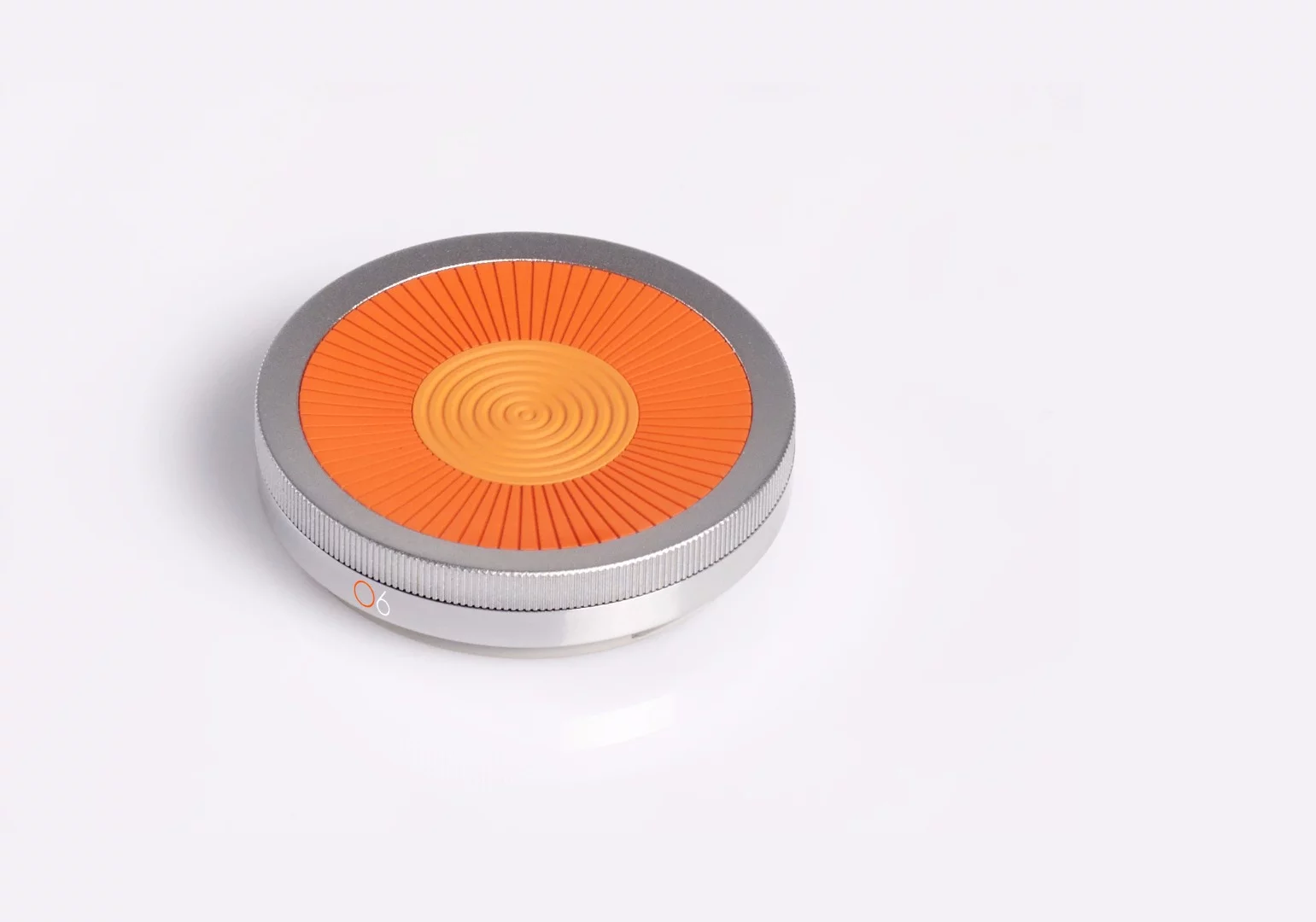 At 40 mm in diameter (1.57 in) and 11 mm (0.43 in) thick, the O6 controller looks like an over-sized jacket button – or perhaps a smartwatch with a funky orange clock face. Underneath its water-resistant, anodized bead-blasted aluminum exterior lies a haptic motor, motion sensors, Bluetooth 4.0 LE connectivity, and a rechargeable battery (all common to smartwatches). The O6 is designed to work with iOS devices – Android compatibility to be set at a later date – and also supports wired or Bluetooth connections to speakers, headphones, or car audio.