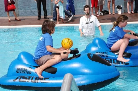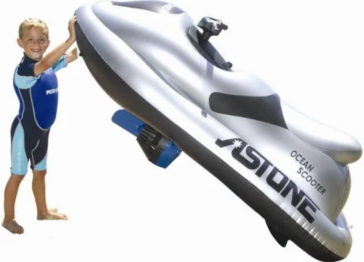 December 22, 2005 What’s better than an Ocean Scooter? Two or more Ocean Scooters – that’s what! This is one of the those products which just screams, “why didn’t someone think of that before?” An inflatable , battery-powered electric boat that’s fast enough to give the kids a thrill, and slow and soft enough to be used in a swimming pool for everything from polo through to your good old fashioned demolition derby. The ASTONE ‘Ocean Scooter’ went on sale in Australia this month but global supplies will be available for the next Northern hemisphere summer. The Ocean Scooter comes with a battery-powered display, a variable speed throttle, automatic power shutdown, full waterproof circuit protection and a protected propeller body which is impenetrable to probing fingers. And at AUD$269, it’ll offer a very high bang-per-buck factor.