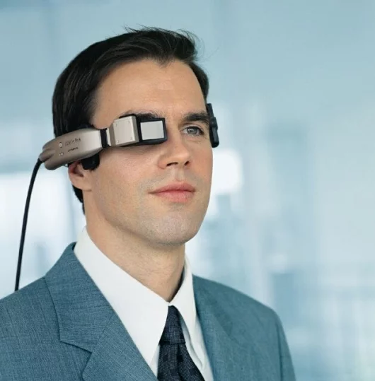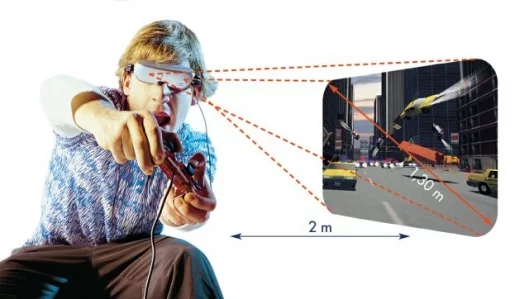 Designed to be as lightweight, compact and wearable as a standard set of sunglasses, the Eye- Trek is aimed at to providing both exceptional stereo sound and vision of cinematic quality in a wearable personal display. For example, the Eye-Trek FMD-250W gives you an image of 240,000 pixels in a 16:9 wide-screen format - equivalent to a 62" screen - from a distance of 2 metres - coupled with audio from SRS (Sound Retrieval System) headphones incorporated into the arms of the unit. The Trek FMD-250W allows you to use your peripheral vision to see what's going on beyond the head-mounted display, or alternatively, an optional sidevisor is available to block out all external distractions.