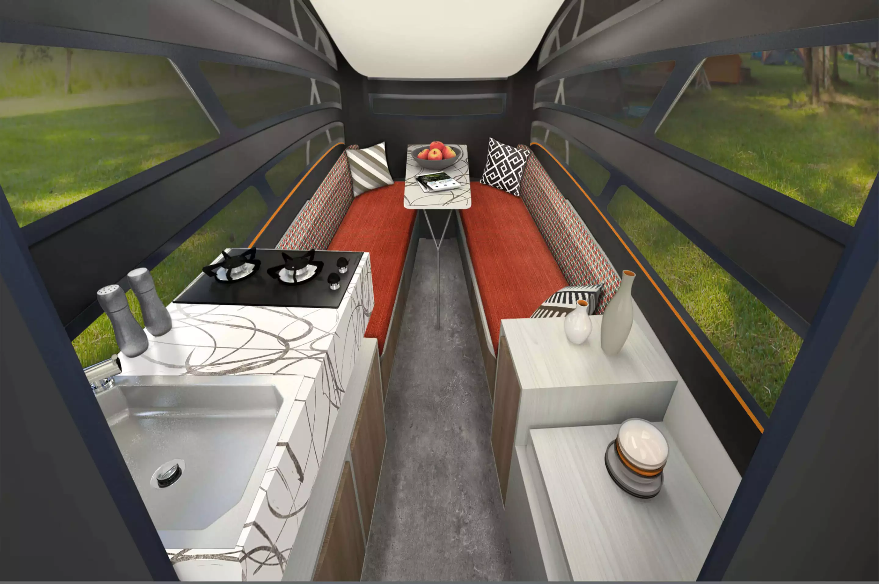 Like a pop-up camper van miniaturized and lightened to towable form, the TakeOff caravan travels small, dropping below the height of a Fiat 500 at just 4 feet (1.2 m). Upon arrival to camp, its roof rises up electrically in 30 seconds, opening up a surprisingly spacious living area that maxes out at 6.7 feet (2.1 m) high. We initially expected to see a simple, teardrop-like interior with just a mattress, but Dutch startup Easy Caravanning manages to fit in a proper daytime/nighttime floor plan with a multi-position dual-bench dinette that converts to a 63 x 81-in (160 x 206-cm) super-queen bed. It even adds an available indoor/outdoor kitchen, with dual-burner stove, sink and fridge, and available portable toilet, giving campers everything they could want from a compact, 1,650-lb (750-kg)-GVWR camping trailer that tows behind small cars just as easily as diesel trucks.