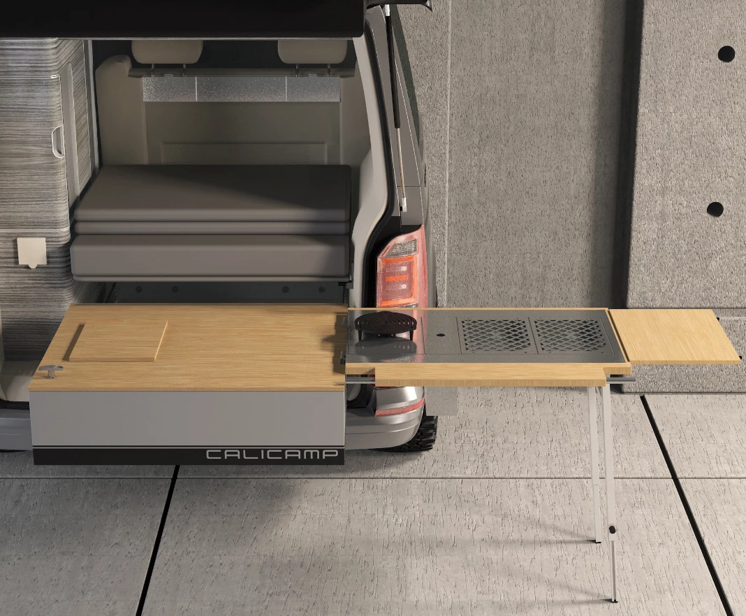 The versatile, modular design of Calicamp's kitchen products reminds us a lot of Snow Peak's Iron Grill Table, albeit built to slide and fold out of the back of a camper van. More specifically, Calicamp builds its storage and cooking systems around the Volkswagen T5, T6 and T6.1 Multivan and California lines. The full kitchen seems particularly useful for models that don't come with their own standard kitchens, such as the Multivan and California Beach Tour, but can also provide more cooking space and an integrated grilling option for full-blown California camper vans with indoor kitchens.