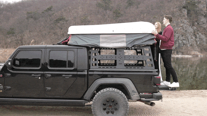 The standard formula for fold-out hard-shell RTTs is to have a strut-assisted hard top that folds to the side, uncovering the folding expansion that drops down to hang over the side of the car, supported by the entry ladder. Such tents work quite similarly to a soft-sided fold-out RTT but end up with a smaller expansion and a single lean to-like hard wall, like so:
