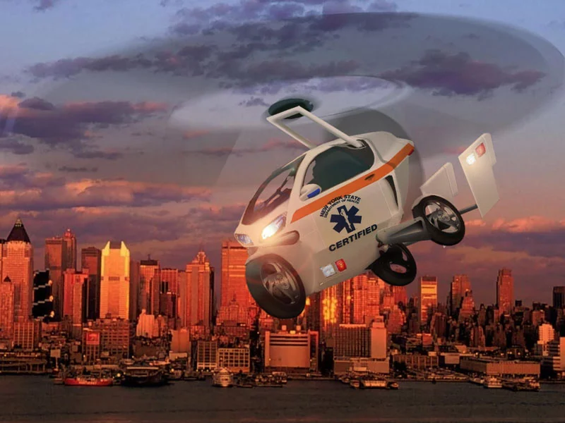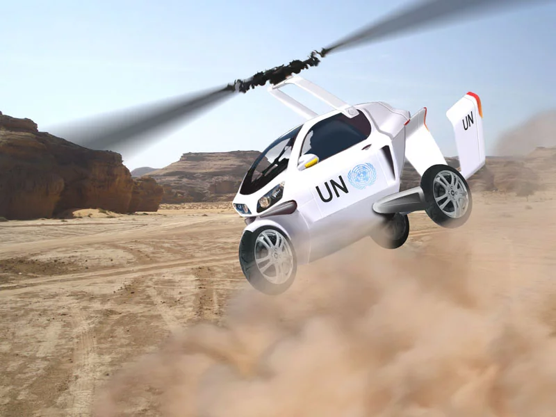 To convert from automobile to airplane, the vehicle’s engine must be brought to a stop – no Transformer-like transition on the go unfortunately. The tail is then extended and the rotor unfolded in a process that takes less than 10 minutes. Upon starting the engine the foldable push propeller emerges from the rear of the cabin to provide the forward thrust. To go from aircraft to automobile, the process is simply reversed.