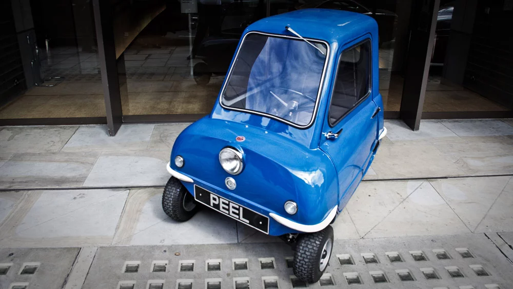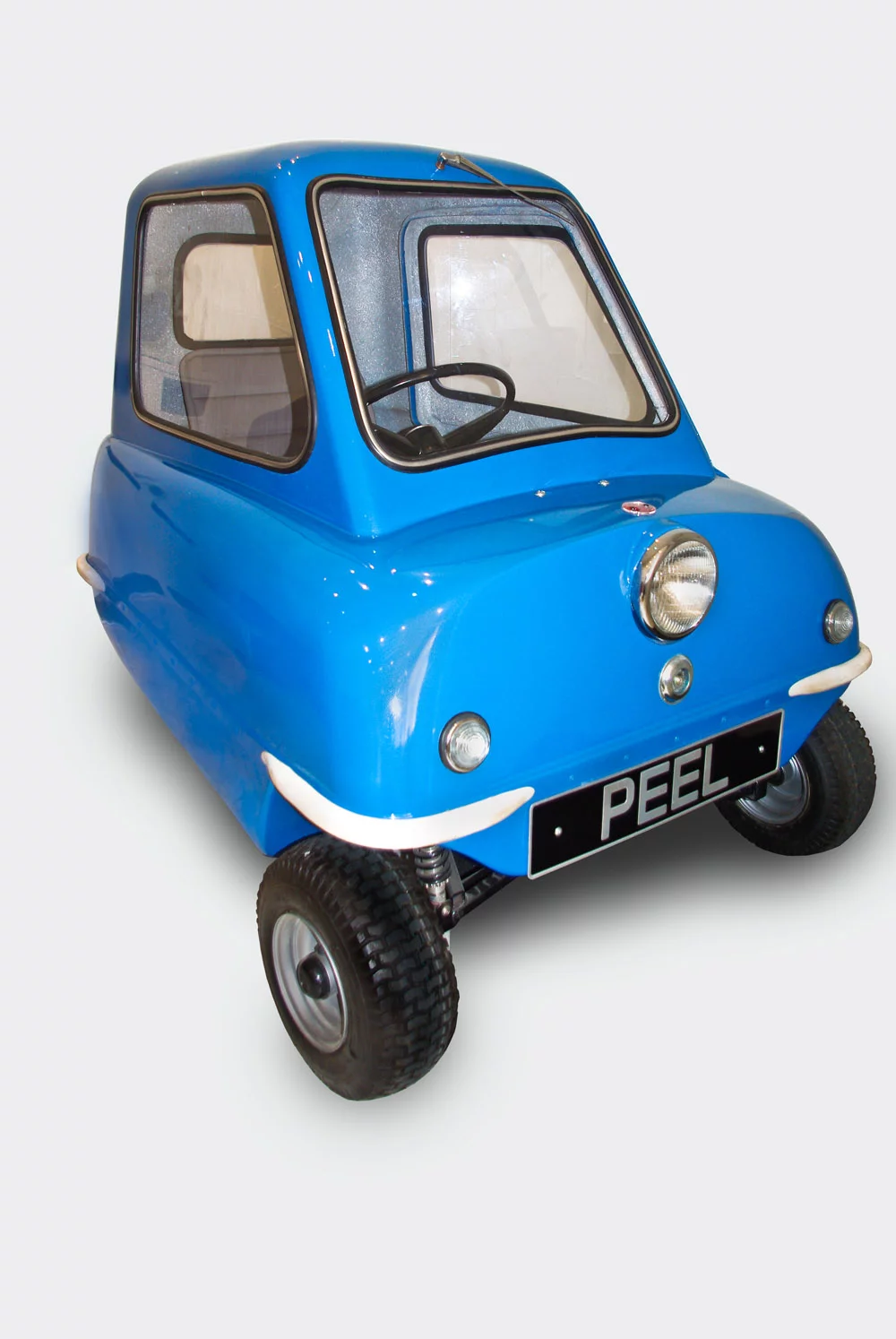 Originally produced on the Isle of Man from 1962 to 1965 by the Peel Engineering Company, the Peel P50 is a three-wheeled microcar with one door, one headlight, and a single windscreen wiper. Powered by a 49 cc engine coupled to a three-speed manual transmission, the car has a top speed of around 38 mph (61 km/h) and no reverse gear. It was designed by, Cyril Cannel, the owner of Peel Engineering Company which focused mainly on making fiberglass boats and fairings for motorcycles. Designed to accommodate a single adult – and a shopping bag – only 50 of the original Peel P50s were produced and sold for GBP199 (approx. US$315) each.