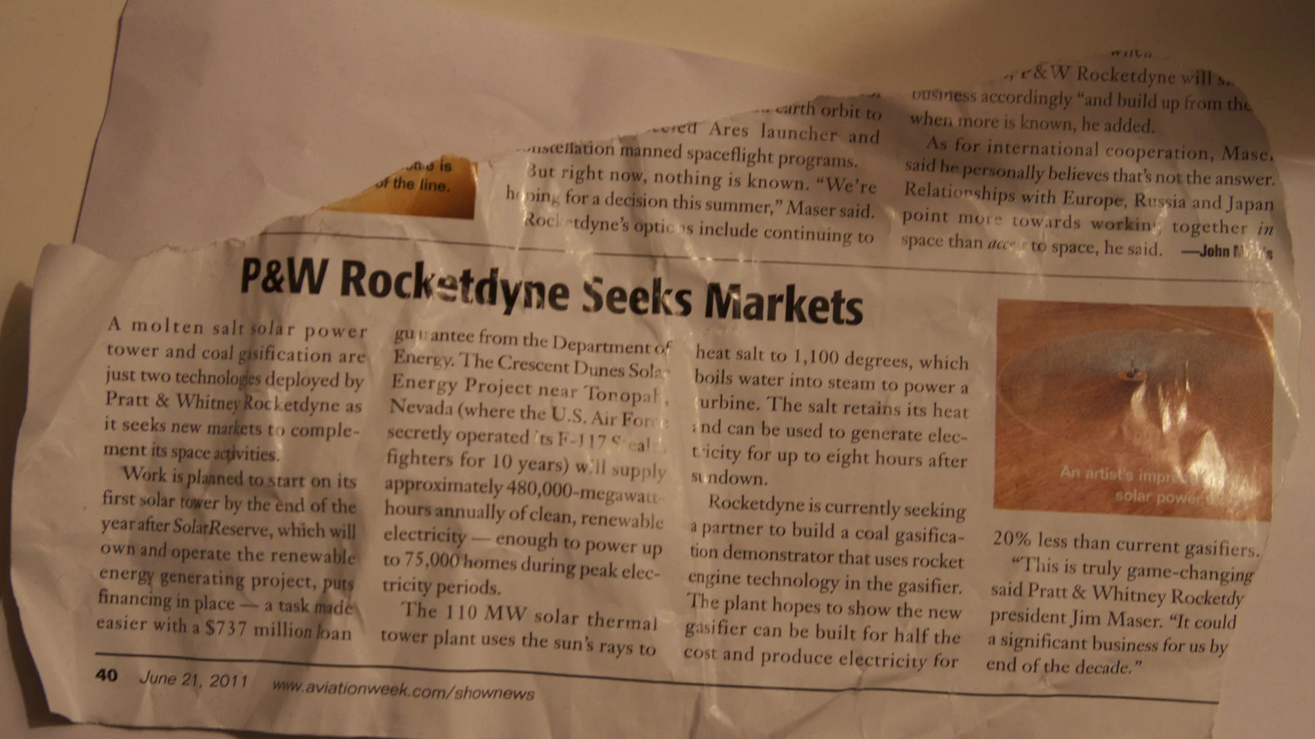 Pratt & Whitney Rocketdyne has already developed designs for CSP Tower technology that uses thousands of articulating mirrors (heliostats) that track the sun and reflect solar energy onto a receiver mounted atop a 600-foot-tall (183 m) tower. Based on technology demonstrated in the Solar Two project, the Pratt & Whitney Rocketdyne designs store the solar energy as heat using liquefied molten salt.