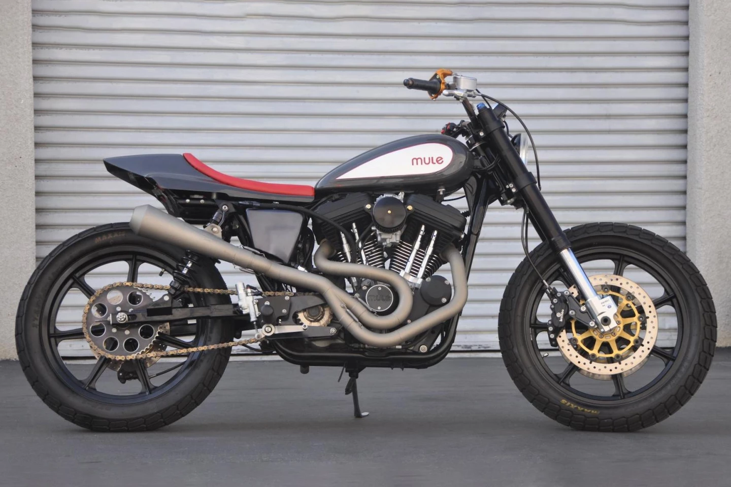 Some people have a knack for being able to turn a great bike into an awesome bike, and street-tracker builder Richard Pollock is one such person. The veteran of over 150 motorcycle builds, Pollock created this Mule Harley-Davidson 1,200cc Street Tracker 20 years ago and it has since done just 1,000 miles. The second and current owner acquired the Mule in 2014 and returned it to Pollock for a tune-up and some updates, namely Mikuni HSR42 carbs, a ceramic-coated megaphone exhaust and a Storz shift kit that converted the gear change from race-style back to conventional one-down/four-up. At that time the bike was treated to new paint in gray and metallic silver with red pinstriping.