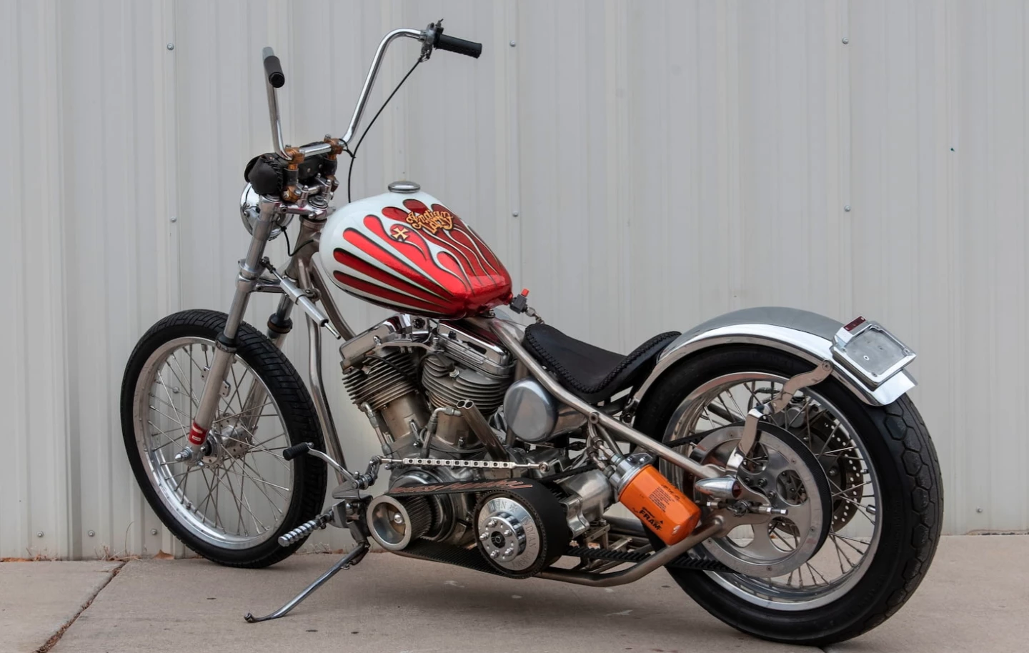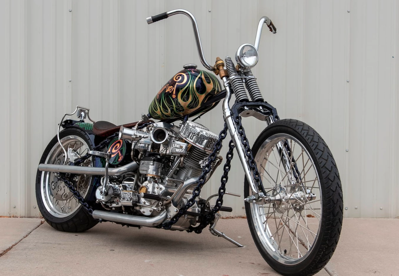 The Chain of Mystery was Indian Larry’s last build, created during Larry’s third appearance on Jesse James’ “Biker Build-Off.” For the occasion, Larry built a frame entirely from chain links. You can see the build and the back story in the video above. Like Grease Monkey in the Lot above, this is a work of art and a cultural artifact as much as a motorcycle, and … the only thing for certain is that watching the auction will be must-see viewing. This bike, as with the bike above, may not be as recognizable to the general public as the original Easyrider Captain America bike, but within the industry, both are equally iconic.