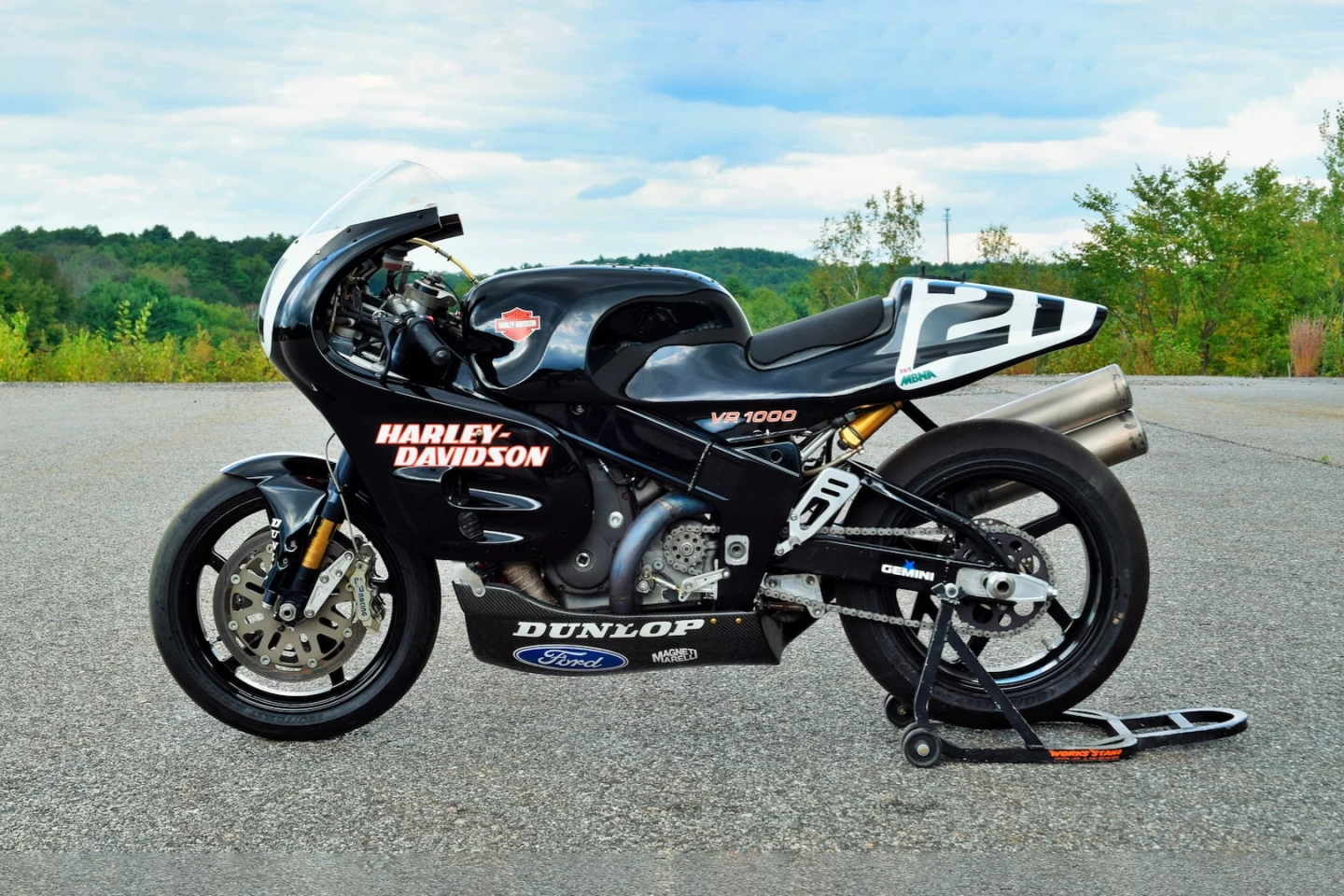 In 1994, with a view to developing expertise with modern high performance engines, and promoting the Harley-Davidson brand, the factory produced 50 of these 1994 VR1000 Road Racers, with 25 outfitted for the street and 25 for the track. The specs are quite impressive, with a 996cc water-cooled 8-valve DOHC 60-degree V-twin producing 135 hp at 10,000 rpm, and a price tag at the time of $49,490. That may seem like a lot, but it was the first liquid-cooled Harley and it was essentially a prototype of sorts for the V-Rod street bike produced from 2011 onwards.This is one of the 25 factory road racers and it was maintained and restored by Gemini Racing, one of the companies used by the Harley-Davidson VR1000 Superbike racing program (1995-2001) as a design and development resource. The track results of the bike were less than impressive, with the rider of this bike, Pascal Picotte, being one of the lesser lights of a star-studded team that included Miguel Duhamel, Doug Chandler, and World Superbike champion Scott Russell. Between them all, over seven years, this bike performed best with a pole position and a handful of podiums.