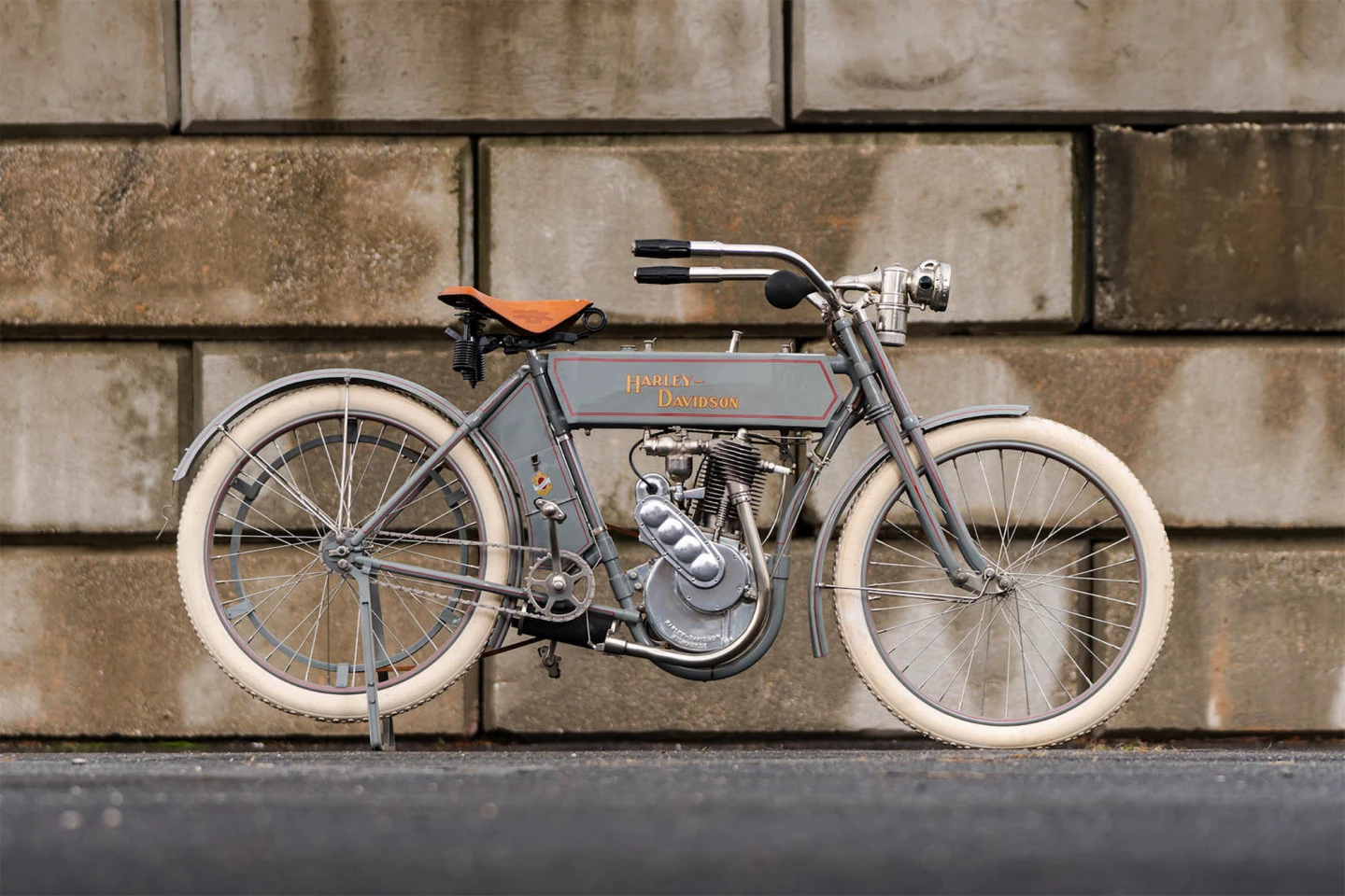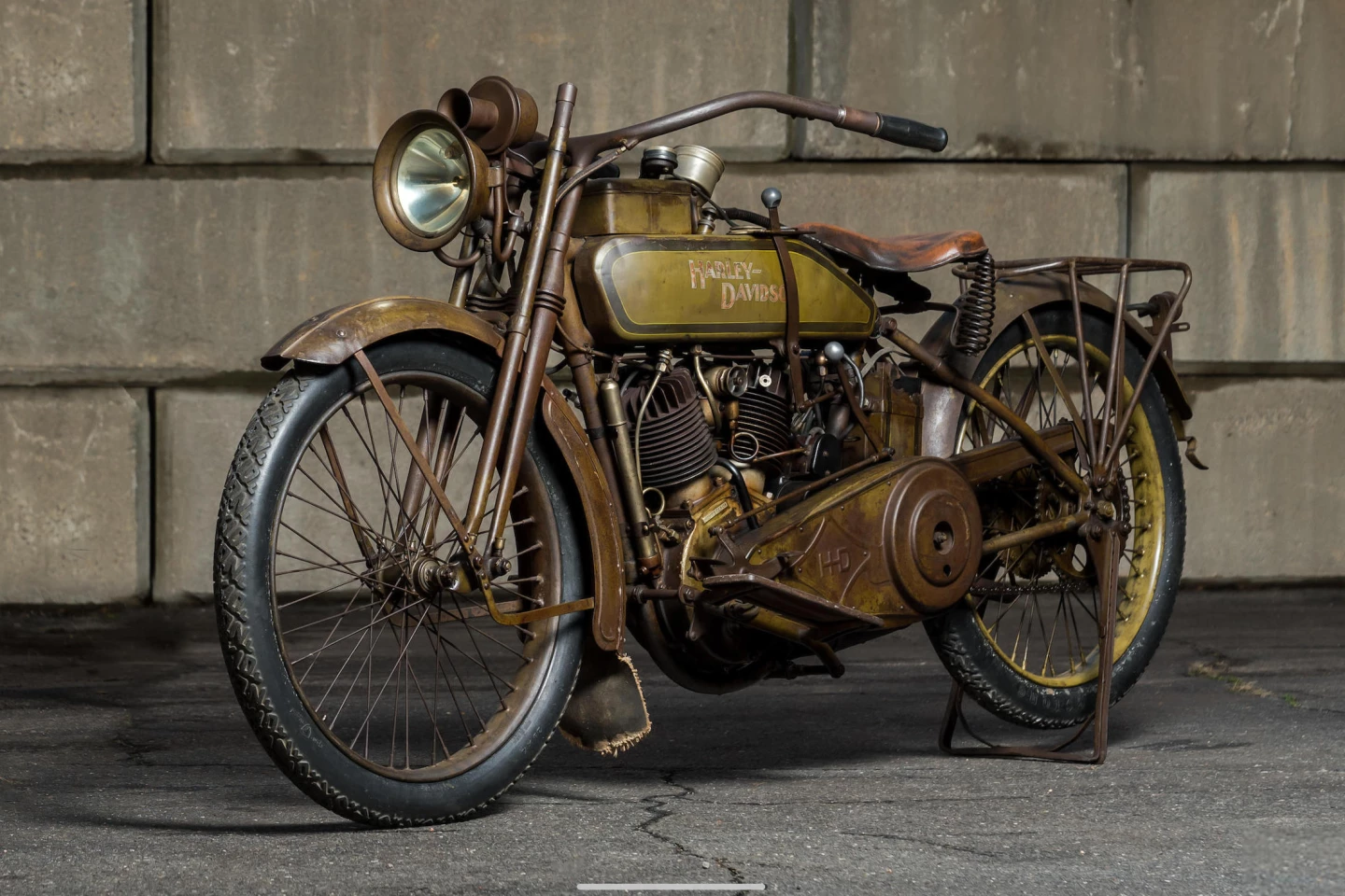 As we have written many times, authenticity is key to the value of any object at auction, and for a 102-year-old motorcycle, there is no greater testimony to this than original paint. The auction description quite rightfully claims that this is “one of the finest original Harleys in the world.” The bike also has an intact and original H-D decal on the steering head, and comes with its original, factory-installed headlamp, taillight, horn, and luggage rack. The H-D stamped leather saddle is also the genuine article and the bike is fitted with original factory options such as the Stewart 75-mph speedometer and drive gear, tank-mounted toolbox and frame-mounted tire pump. This 1918 model suffered from a problematic ignition, and most were replaced in period. This bike's ignition was updated in the late 1920s or early 1930s, and a factory tank-top ammeter and bracket were added at that time.