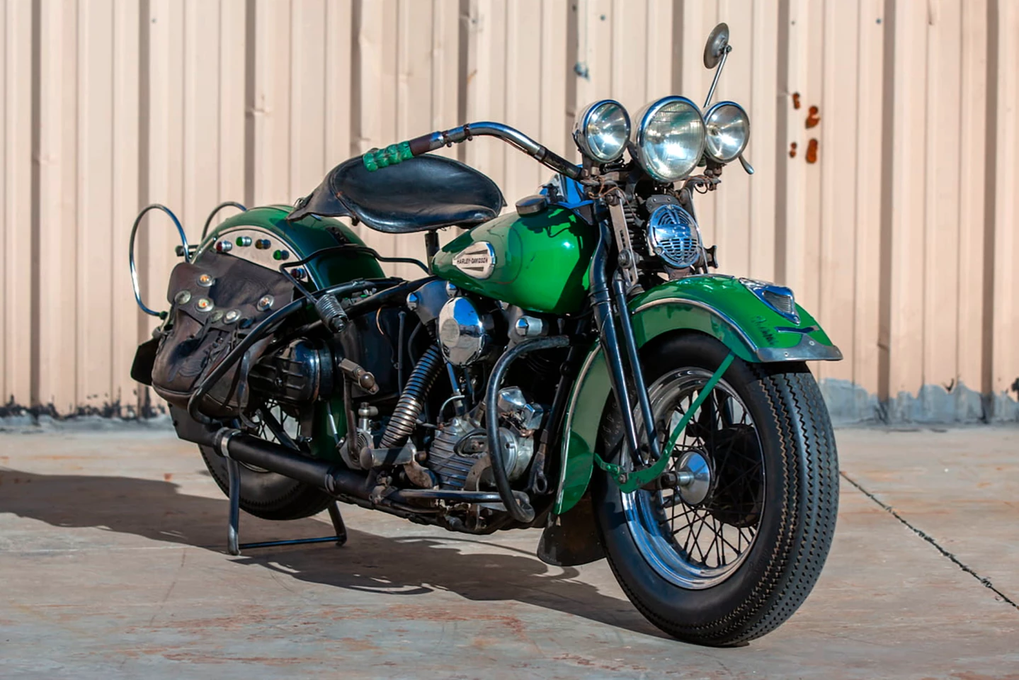 This bike has an interesting past. When it was sold at auction to the current owner for a record-setting price of $159,000, it was one of a number of high-priced Knuckleheads sold in Las Vegas six years ago. Since then, the vendor has established that, although the green paint was supposedly not available in the Harley-Davidson catalog at that time, this bike was delivered new in this color. By tracking down the original invoices, he subsequently proved that this bike was ordered from the factory with green paint and nickel plating instead of chrome, as well as many extra details. His detective work is expected to double his money inside six years. There’s a lot of difference between a delightful, non-authentic older restoration and a unique original-paint factory special