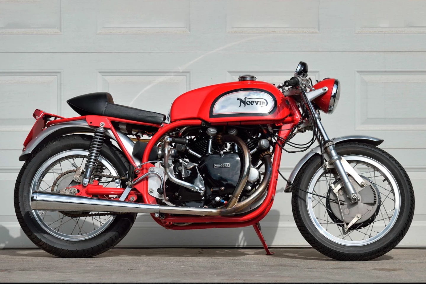 The thought of cutting up a near-sacred object like a Vincent Rapide or Black Shadow may seem outrageous today, but it would have seemed like the most obvious thing to do in the mid-1950s when Vincent was known as producing the fastest bikes in the world, and Norton’s “featherbed” frame was a household term. The most famous Norvin in history is that of John Surtees, who was the very first to put a 1,000cc Vincent V-twin motor in a Norton Manx chassis. Surtees wanted to build an unlimited class bike with more power than a 500cc single, and when World Sidecar Champion Eric Oliver decided to build a Cooper Formula 3 car using a Manx engine, Surtees purchased the remaining Manx Norton rolling-chassis and began building and installing a potent Vincent engine. He never got to race the Norvin, as he was signed by the Norton factory team before it was ready and his career then took him onwards to MV Agusta. News of Surtees build became common knowledge due to the British motorcycle press and many Norvins were built from that point forward, using Norton featherbed frames from the International, ES2 or from the Norton twins. This Norvin was built in period using a 1951 Rapide engine and 1954 Norton Wideline Featherbed frame. It has been in the vendor’s possession since 1968, and it has a fresh engine with modern pistons, a modern clutch, uprated 12V alternator system with electronic ignition, flat-slide carburetors and Grimeca four-leading-shoe front brakes.