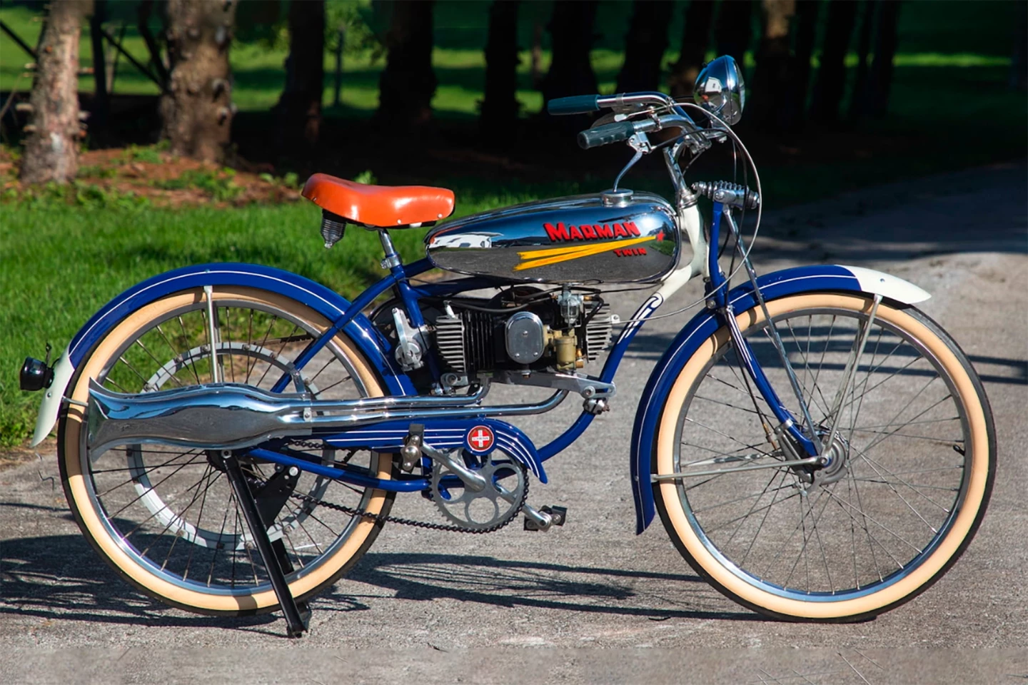 Every art form has its zenith, and the zenith for motorized bicycles is arguably this twin-cylinder Marman, which was the unlikely marriage of a horizontally-opposed two-stroke engine in a bicycle frame, with a logo that looks at first glance to read “Madman”. The engine was designed as a cheapie for pulling target aircraft drones during WW2 and repurposed. In true it-could-only-happen-in-America fashion, the product was conceived and the company was owned by the fourth of the Marx Brothers, Zeppo Marx. It’s true!