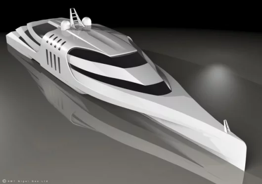 September 4, 2008 Now here’s one sure to make the shopping lists of the world’s richest marine enthusiasts. BMT Nigel Gee has announced a high-speed Pentamaran concept aimed at the large yacht market. Developed for high-speed applications, the patented Pentamaran hull form is a derivative of the stabilized monohull concept featuring a long slender central hull, hydrodynamically optimized without the constraints of needing to be stable as stability is provided by two pairs of outriggers or ‘sponsons’. Project Veloce is truly an innovative application of technology in the large yacht market and is based on a 130m platform capable of over 40 knots. The beam of 30m offers significantly more internal area than on an equivalently sized monohull leading to exceptional internal spaces with true flexibility in configuration of the layout.