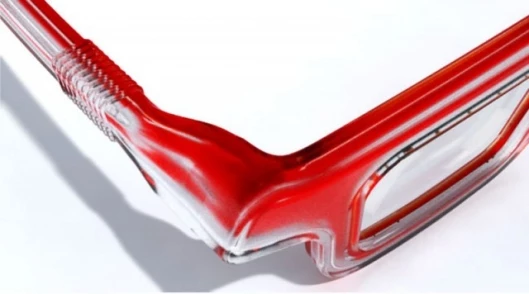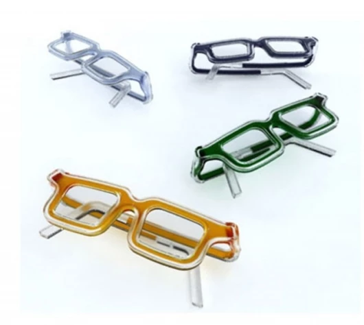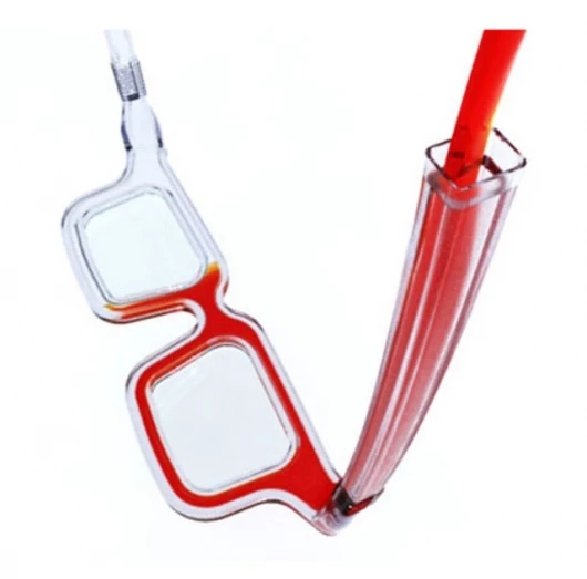 The RbG glasses are made from clear plastic with an internal channel for the colored ink to pass through and a flexible, enclosed hinge to prevent leakage. This "paints" the frames with the desired color and allows you to choose the right hue for whatever occasion presents itself.