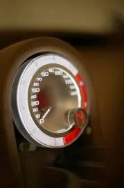 The design of the combined speedo-tachometer dial is both simple and sophisticated. With an anodized aluminium surround, it is cut into a glass cylinder. Data is displayed in both analogue (a needle indicating speed) and digital form.