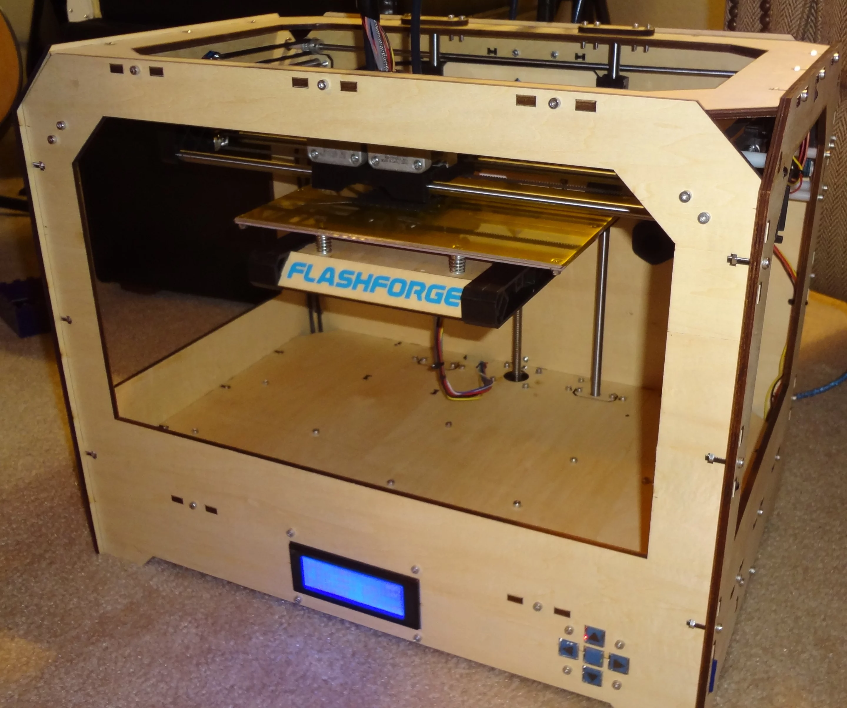 Another annoying item are the front buttons. The case for this printer, as you can see in the pictures, is wood – specifically laser-cut plywood, which is a good, sturdy material that can be painted, modified, and easily repaired. However, the front buttons are always getting hung up on the cutouts, causing unintended button presses. Several times the printer has started printing something from the SD card on its own when the center "enter" key got stuck. This also makes it difficult to perform the platform levelling alignment, which requires many pushes of the enter button.