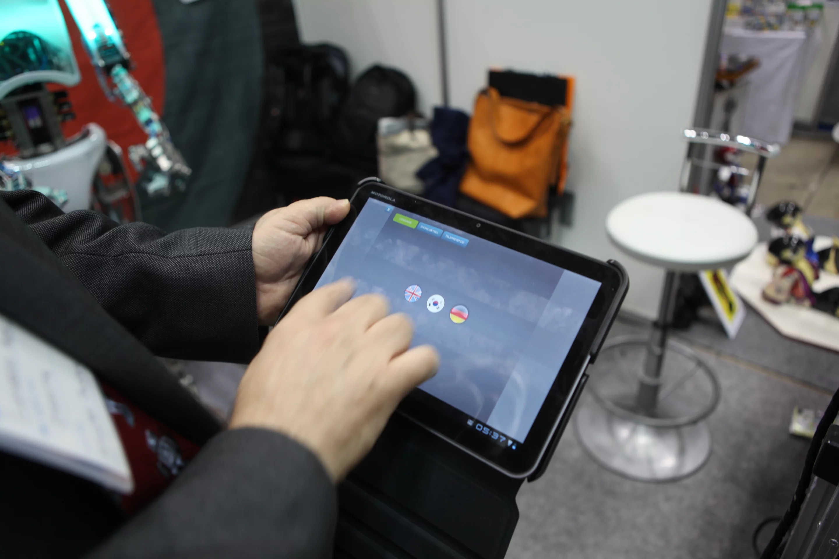 The humanoid is 1m 75cm (5'9") tall, weighs in at 33 kg (73 lbs), sports an aluminum chassis and a body shell made of polyethylene terephthalate. It offers over 30 axes of movement, with some movements handled by air muscles and other by servo motors. There is an integrated computer on board with a 1.6 GHz Atom processor and a 32GB SSD to store motion information and control software. A head-mounted camera enables remote image streaming for telepresence purposes (again, face tracking capabilities come in handy). There is also an integrated 20W audio amp for verbal delivery. The robot comes with an interface PC and a 19-inch touchscreen housed in a standing console. To operate, it requires an electrical supply, a compressed air supply and an Internet connection used for remote maintenance and diagnostics.