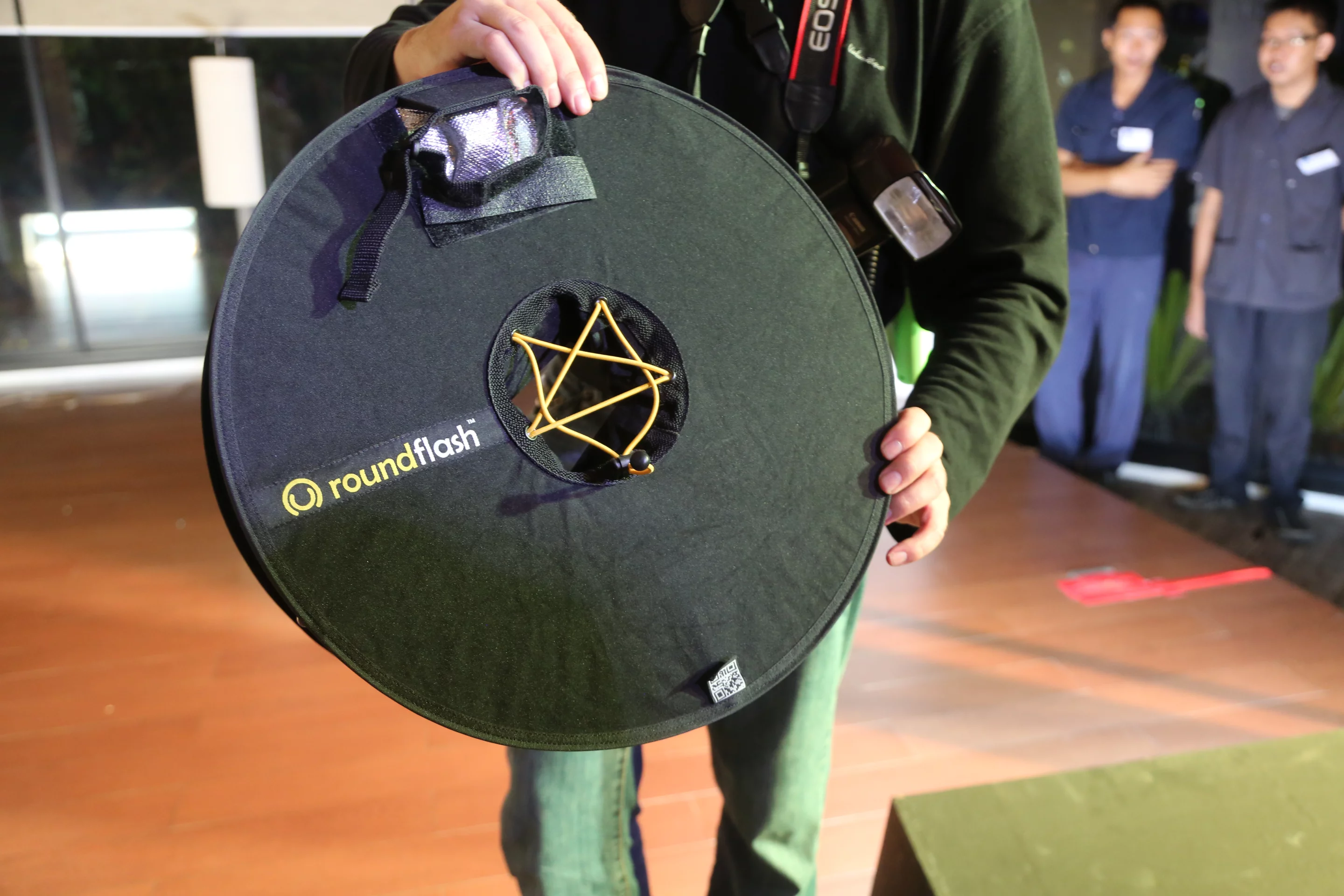 The RoundFlash Dish attaches directly to a flash using a built-in velcro strap and creates the same 45 cm (17.7 in) diameter as the Ring when set up, on this occasion by pulling it forward to connect two metal tubes. It weighs just 155 g (5.5 oz), which means you are barely going to notice it in your bag.