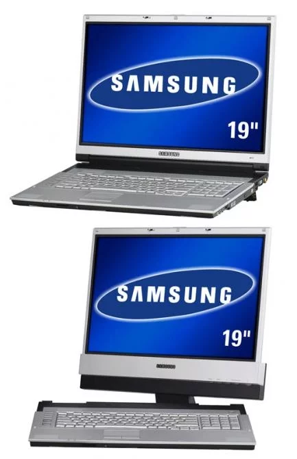 August 29, 2005 Samsung will debut a promising new notebook concept at the upcoming IFA Consumer Electronics Show in Berlin which opens September 2. It would be easy to accuse Samsung of continuing to play the same “mine’s bigger than yours” game it plays with camera phones, but the details emerging surrounding the new 19 inch notebook suggest it is indeed a new portable computer paradigm. The M70 will be a logical desktop replacement for those with big screen needs as the screen can be removed and has a dock which enables it to stand upright, giving the notebook two personalities – one as a large “laptop for use in transit and the other as a conveniently transportable desktop which can have discrete components. So whilst the M70 will be the first 19-inch notebook in the world, it could be seen as a new conveniently portable desktop and might be seen as a landmark design in the evolving form factor of the computer.