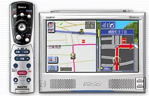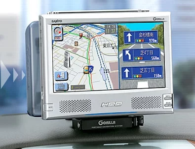 The Gorilla NV-HD 500 from Sanyo is a navigation device/ DVD player with a 20GB hard drive and a GPS receiver. It can be used as a handheld device or put into a cradle in a car for full entertainment functionality.