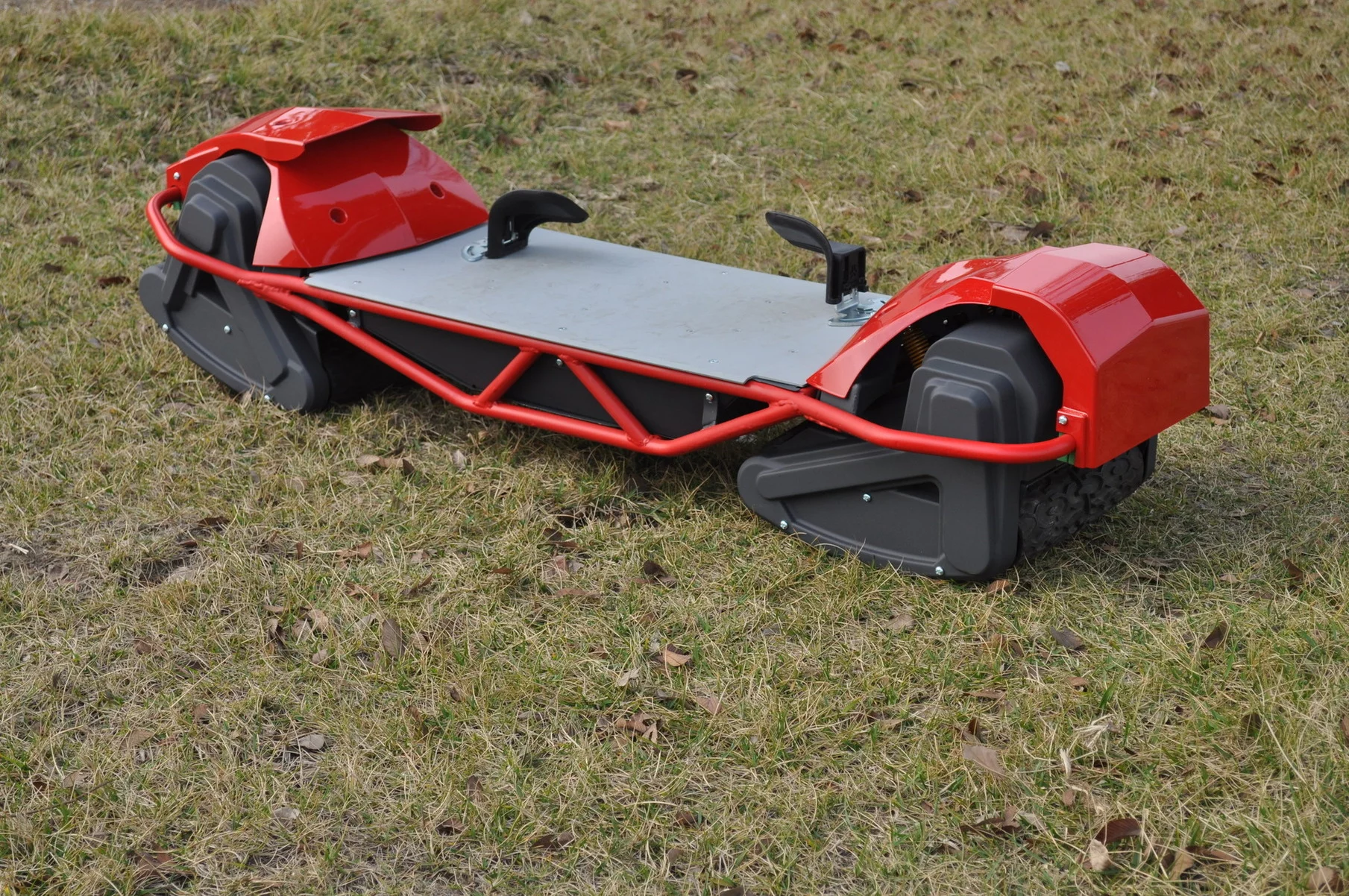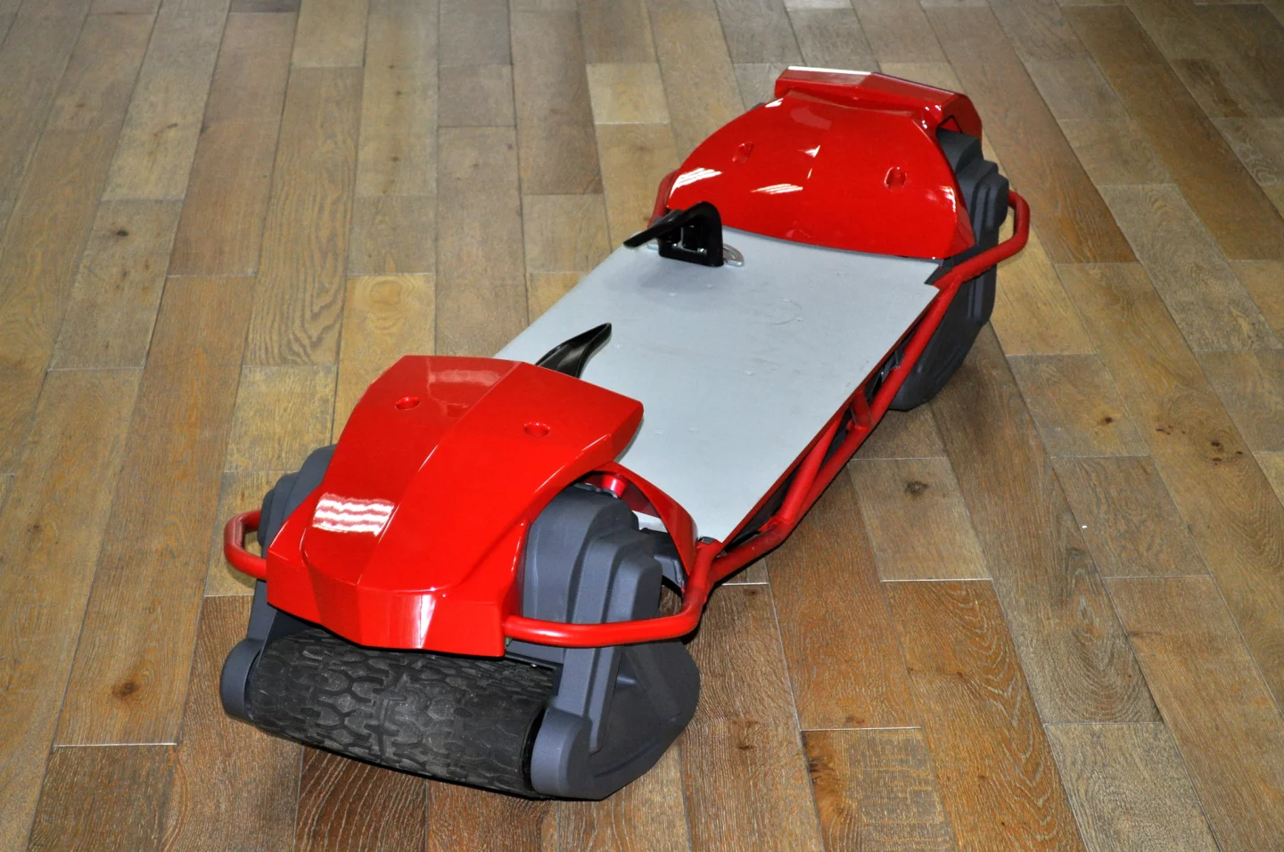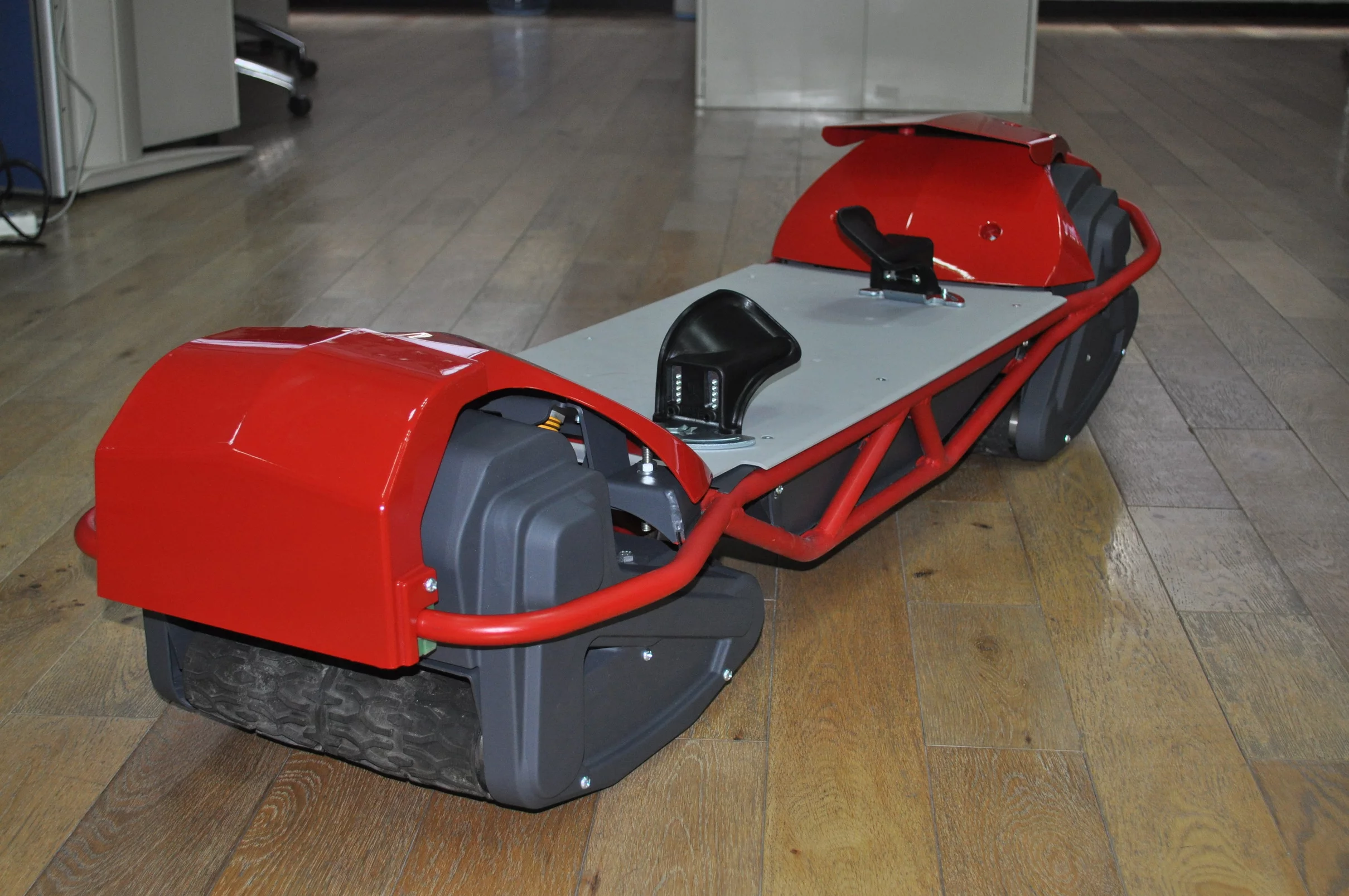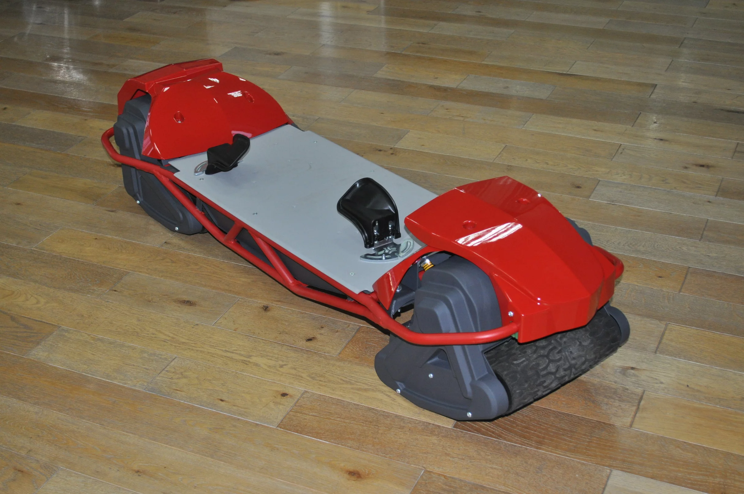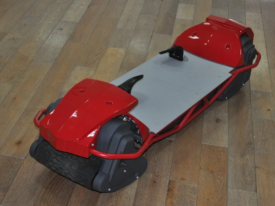 With its articulating tracks, steering the Scarpar is the same as steering a skateboard, snowboard, or even a surfboard: simple weight transfer. Lean and go. The throttle and brake, however, are handled by a handheld control device."One really cool thing that we've been able to do as part of the engineering process has been to make the control system wireless," says Fern, "and that's not an insignificant challenge, either, dealing with things like disassociation of the controller, and dealing with all the safety aspects. Interference, where somebody else accelerates for you, that's not a good idea! But we've had the right guys working on this, they're way smarter than me and they've come up with some really good solutions. Everything from the geometry upwards."