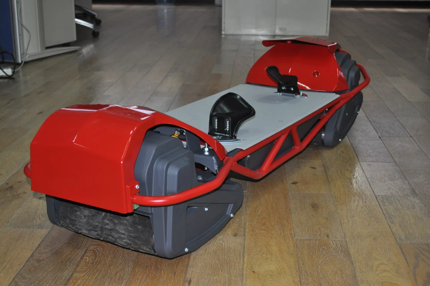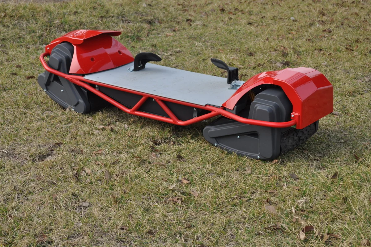 Last time we checked, the Scarpar prototype was running on a 2-stroke petrol engine - but in the process of getting it production ready, this has changed to two electric motors, one in each articulating track.