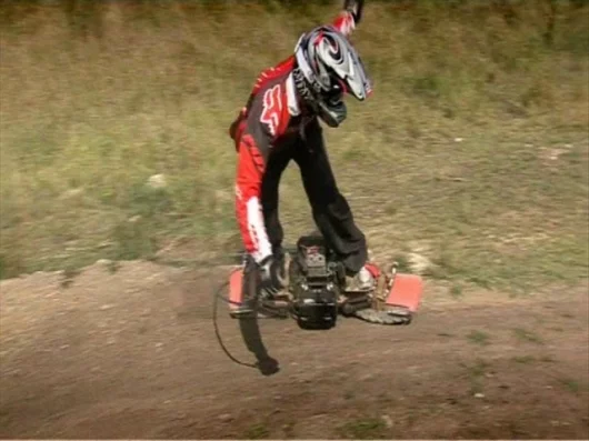 Two years ago, we had a look at the Scarpar - a twin-tracked, high speed all terrain powerboard that seemed like a promising power toy. Well, we've just spoken to Scarpar CEO Andrew Fern, who has confirmed that this unique vehicle is going into production later this year, and he's taking deposits as of now. Basically everything on the board has been changed since the last prototype we saw - it now runs an independent electric motor in each of the two articulating tracks, and the hand-held throttle and brake unit is now wireless. And as Fern describes after the jump, getting it to a production-ready point has been a herculean effort; his design team more or less had to create their own realm of engineering theory to deal with such an unprecedented set of vehicle dynamics. The following interview is a fascinating look into the development cycle of a new product. Most importantly though, the Scarpar still looks like extreme fun, and a remarkable way to launch yourself into the foliage.