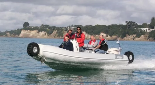 July 19, 2007 Sealegs new 7.1 metre amphibious boat is about to commence volume production following successful sea trials. The NZ$98,000 (US$77,600) 7.1m Rigid Inflatable Boat (RIB) is the third and largest model released by the amphibious boat manufacturer and is expected to attract a lot of interest from tourism and water transportation operators. Its obvious strength is the additional space, which enables eight adults to be comfortably seated within its 700kg payload. It has a top land speed of 10 kph and with an 115hp motor can do up to 78 kph on water.