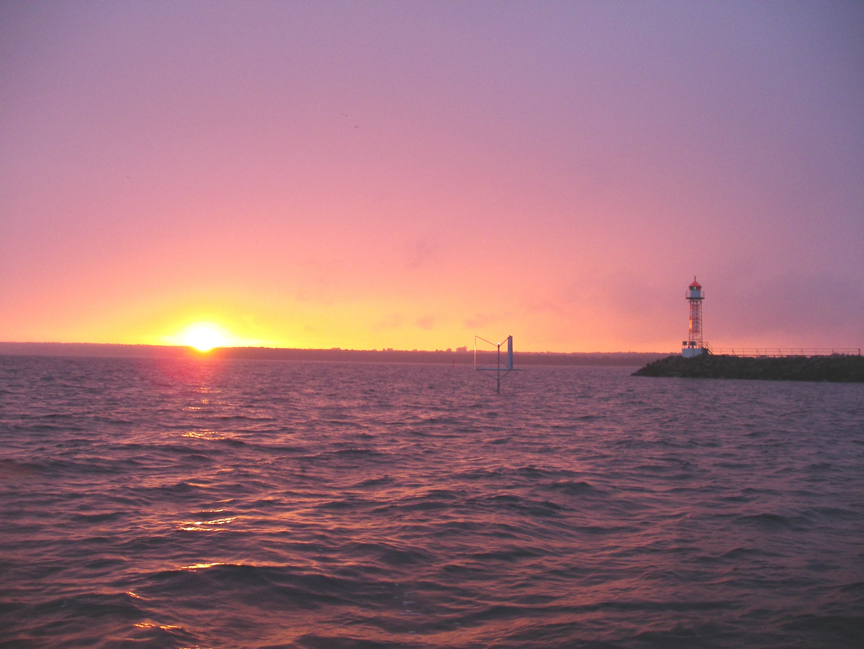 An axle runs vertically through the center of the turbine and proceeds into the water. Mounted on that axle, just below the surface, is a hollow cylindrical float body. At the bottom of the axle is a generator. The whole system is held in place by anchoring lines attached to the bottom of the generator.