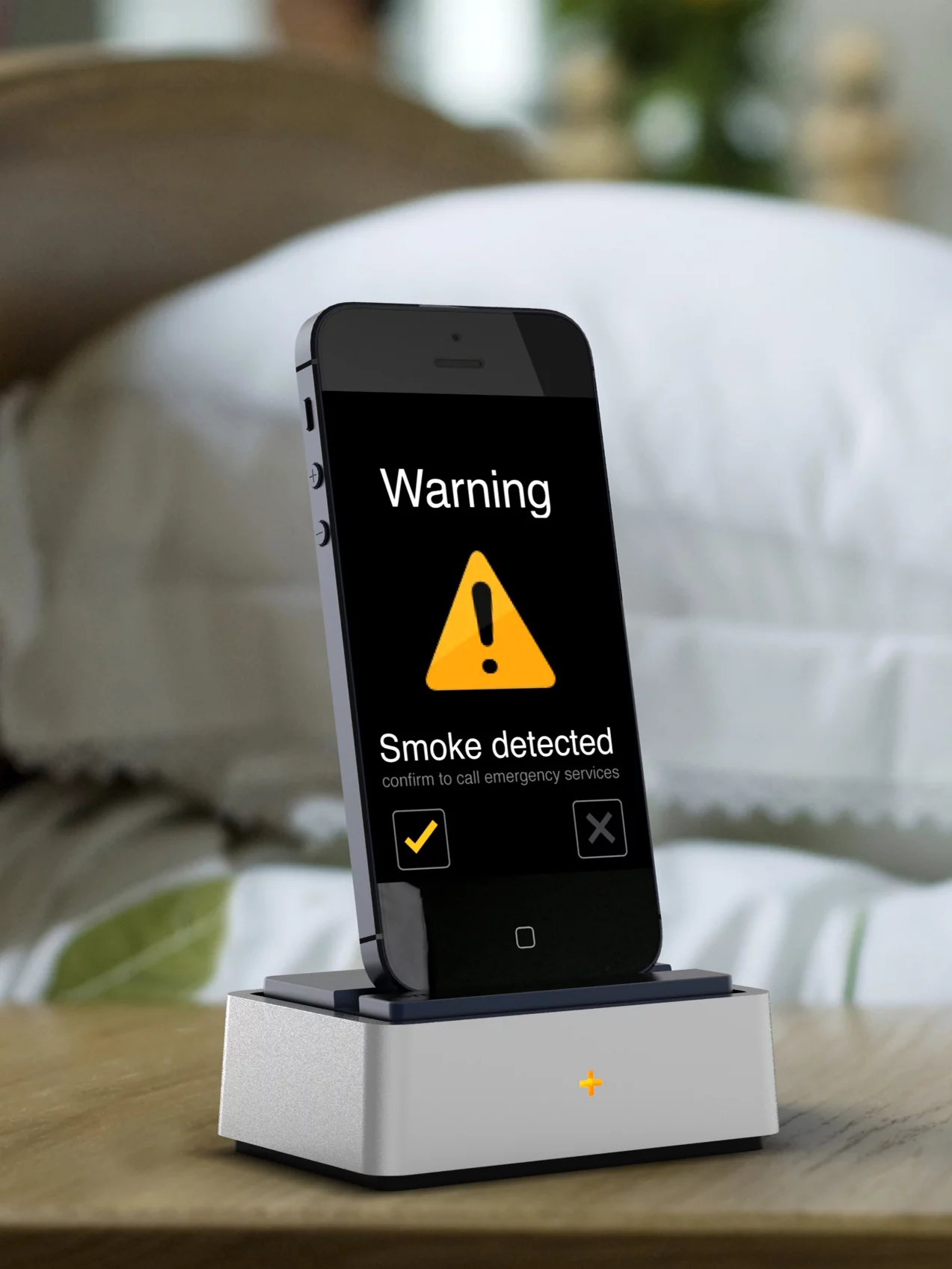 If the dock detects smoke or carbon monoxide, it will sound an alarm and the accompanying app will ask the user to respond. If no response is forthcoming, the app will automatically call all the numbers listed in the phone’s home call group. The app will then display an alert screen offering to call emergency services, which the user can accept or decline.