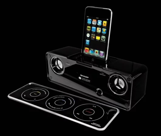 Sharp has designed its new iPod docking system to match the look and feel of an iPod or iPhone. Finished in glossy piano black, the DK-AP8 has a removable touch panel that controls the system button-free via infrared. Something a little different, the Sharp unit has various ports including AUX input and video (FBAS) output on the back which enables it to be connected to a TV for viewing photos or videos stored on the iPhone or iPod.