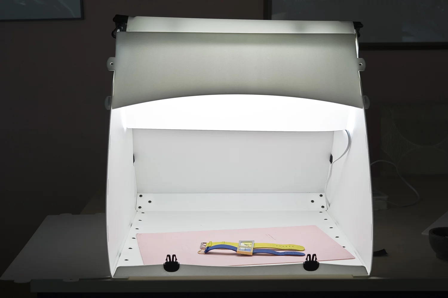 To use the Simp-Q, you open it up, clip on the reflectors, turn on its lights, then position your subject. If you want a background or base other than white, you throw it in. When it’s time to take your photos, you can just use the basic front reflector and leave the rest of the front open, or add on the larger front reflector, and shoot through its built-in camera hole.