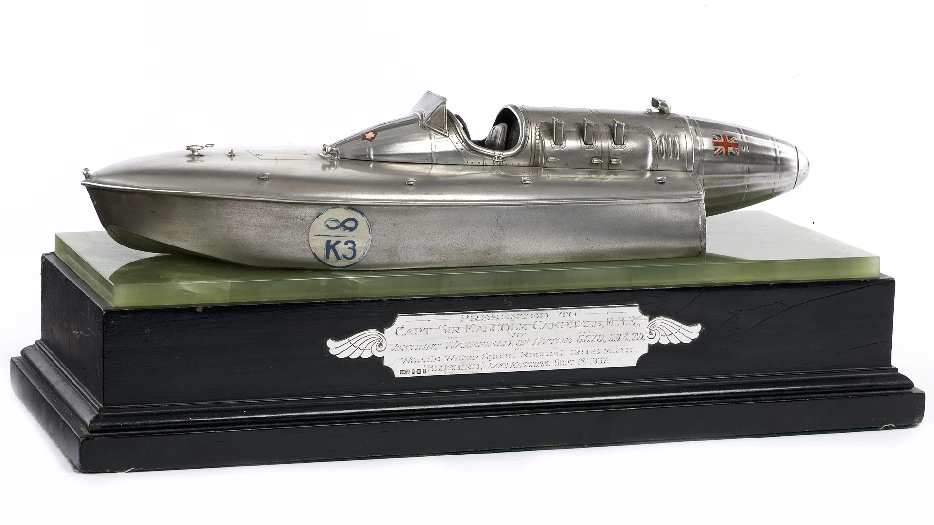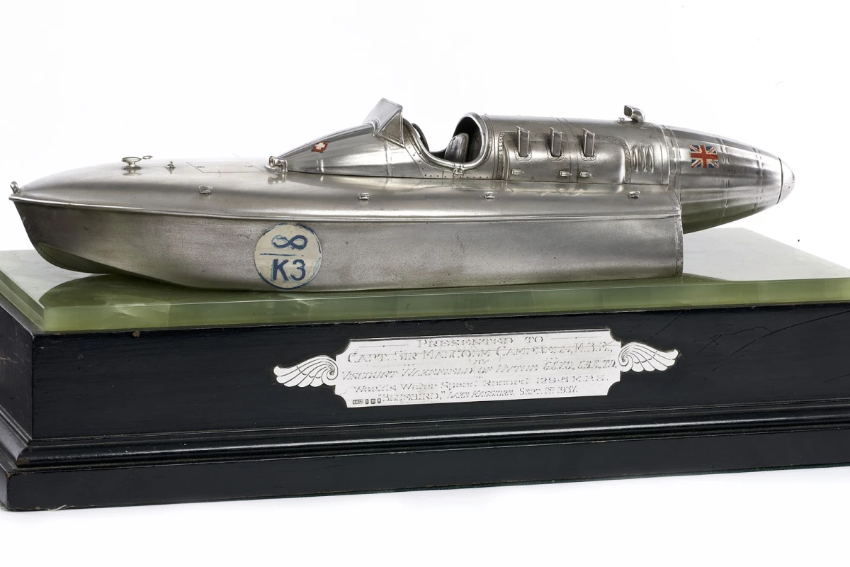 The trophy, a waterline model of Campbell’s single step hydroplane “Bluebird K3”, was awarded to Campbell by Lord Wakefield, the director of CC Wakefield and Co Ltd, the ‘Castrol’ oil company, who was a keen supporter of motor and aviation development. It has attracted a pre-sale estimate of £35,000 – 50,000. Campbell broke nine land speed records between 1924 and 1935, and was the first man to exceed 300mph on land in 1935. He went on to break four water speed records; his highest speed on water was 141.74mph in 1939 in a Bluebird K4 on Coniston Water.