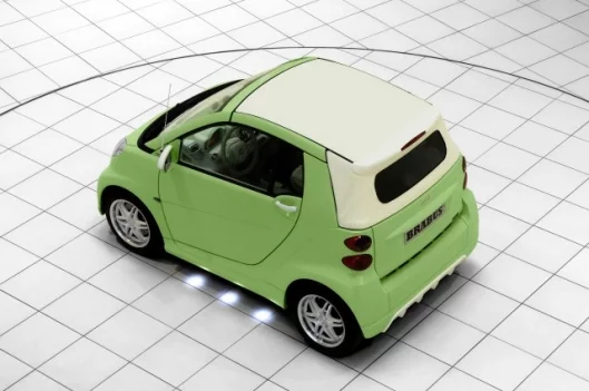 March 4, 2009Following on from the cosmetically customized version of the Tesla Roadster which debuted at the Essen Motor Show 2008, German tuning house BRABUS has seen the writing on the wall and launched a second electric car, this time based on a Smart fortwo. Drowned in matt green throughout the exterior and interior, the car comes with the same style monoblock light-alloy wheels and the (somewhat gimmicky) LED Daytime running lights as used on the Tesla, as well as some real technical innovation in the drive train.