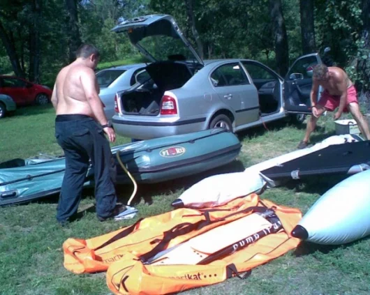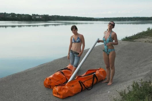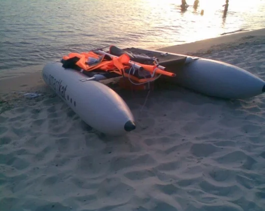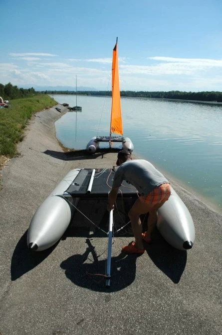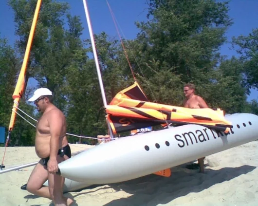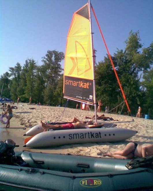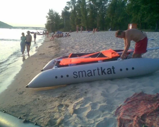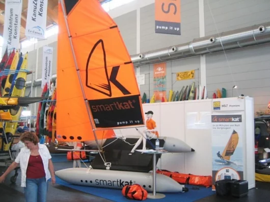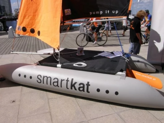 February 4, 2008 Necessity catalyzes invention, so it makes sense that eventually someone would come up with a collapsible boat that doesn’t require a trailer, and can be stored in a cupboard. At just 39 kg with 10 square meters of sail, the Smartkat is not only fast on the water, it is also fast to build (20 minutes), and even faster to put back in its two 180 x 30 x 30 cm bags (10 minutes), all done without tools.