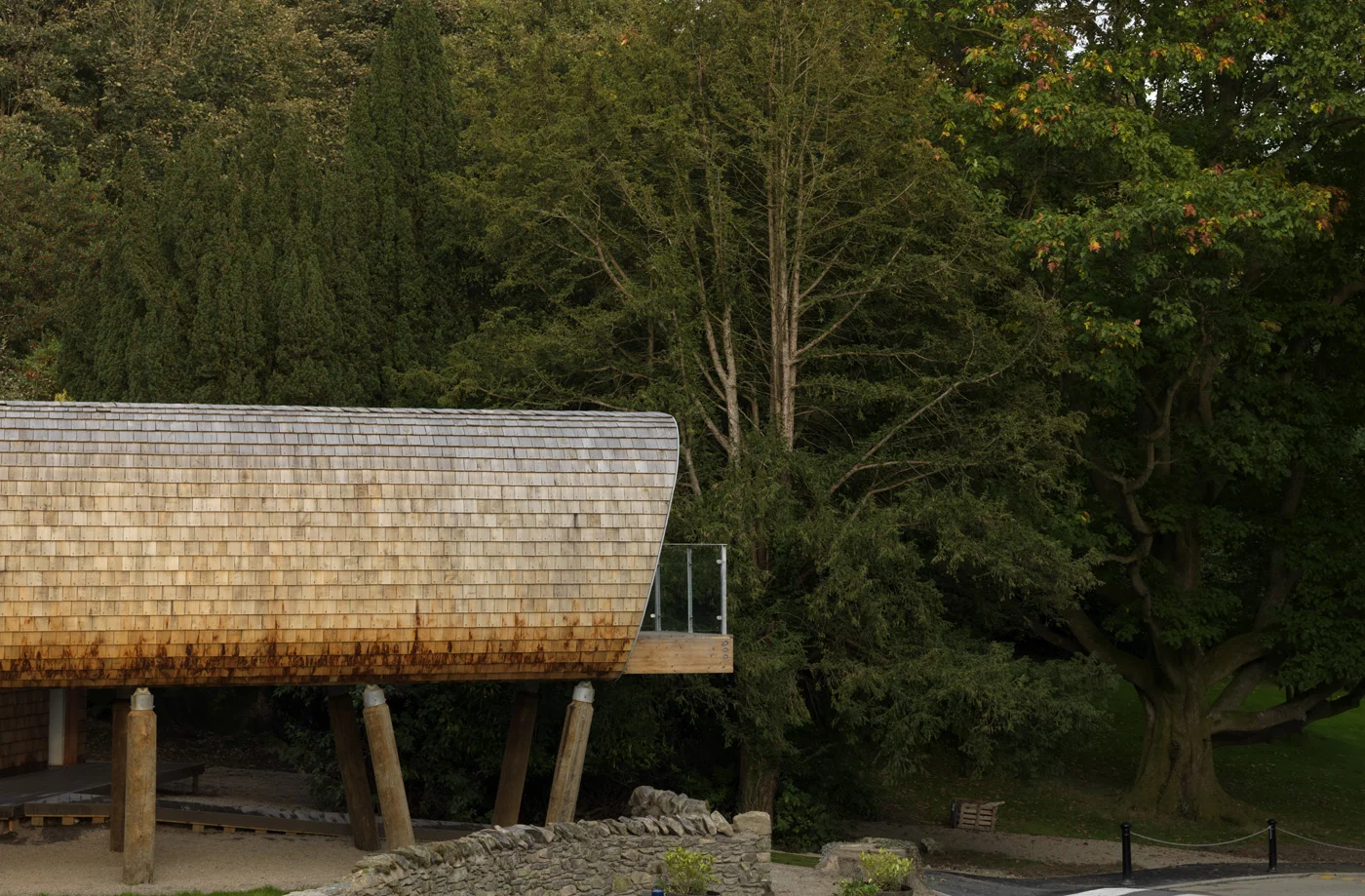 The classrooms sit high above the flora and fauna and are constructed from a ribbed timber frame which sits on atop Douglas fir stilts. Buildings are clad in English chestnut shingles and the deck, which connects the three classrooms, can be used as an outdoor teaching environment when weather permits.