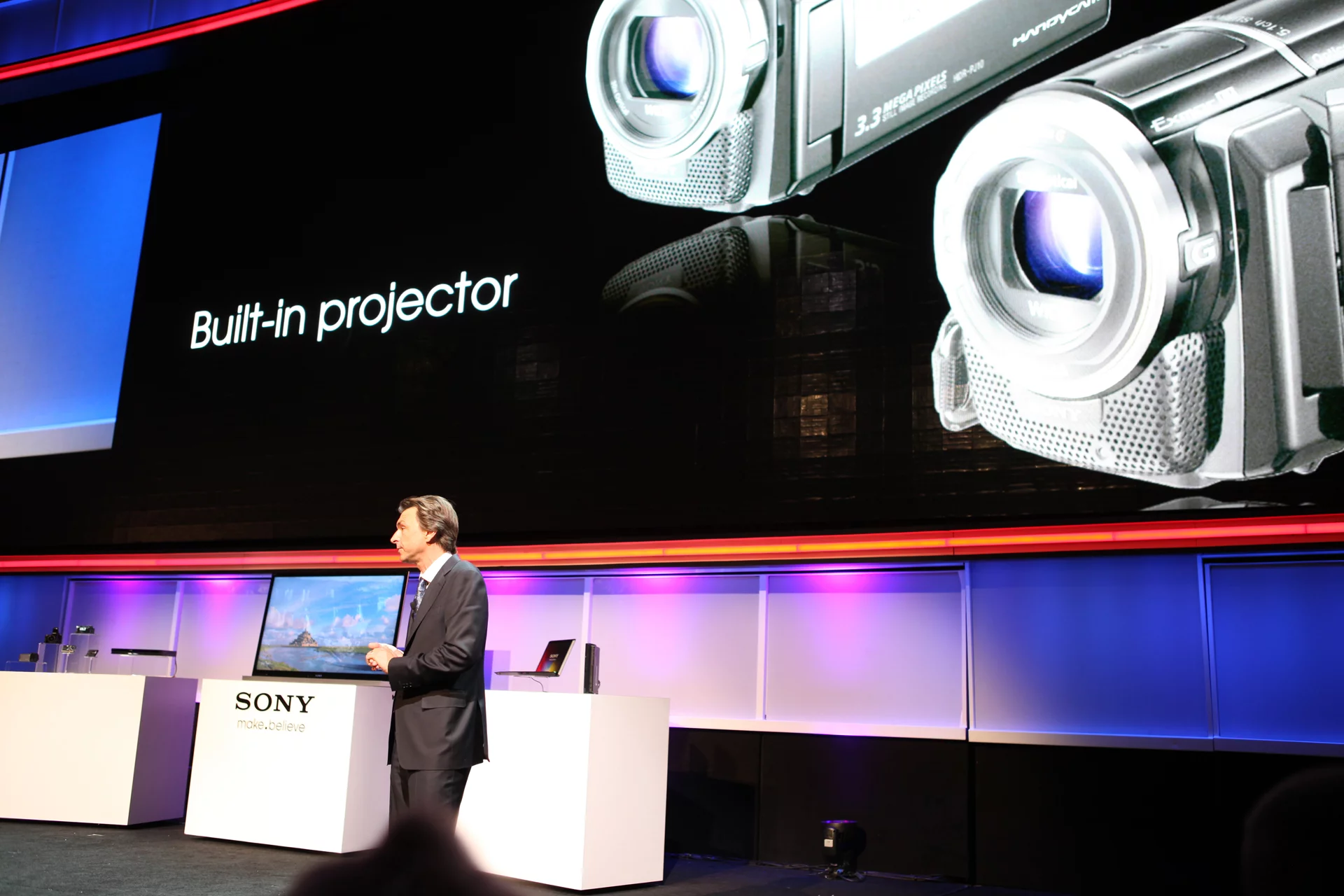 Also worth noting amongst the new additions was the HDR-PJ series, which consists of three models that all feature an LED projector built into their flip out display panels. According to Sony these camcorders can project an image of up to 60 inches/152 cm (diagonally; when projected from 20 feet/6 m away) onto flat surfaces such as walls or ceilings.