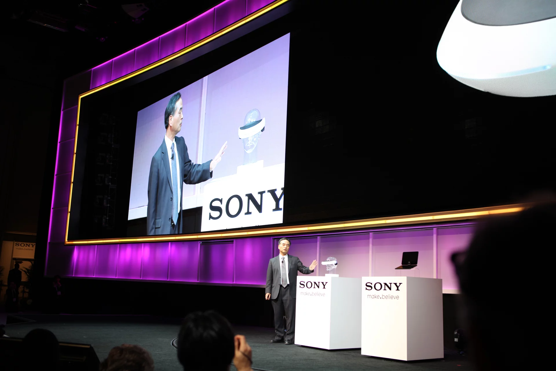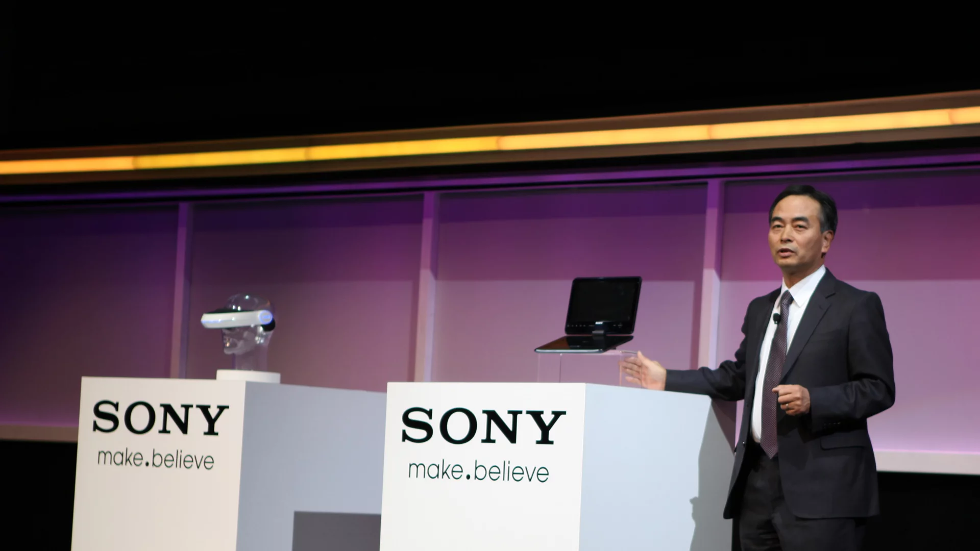 In addition to providing 3D visuals, which need to be manually calibrated for each user through a dial on the unit, the prototype headset also features simulated 5.1 channel surround sound via the integrated earpieces. In it its current form the headset doesn’t include any means to hold it in place such as a strap, but Sony Executive Deputy President Hiroshi Yoshioka says he had used the device to play Gran Turismo 5.