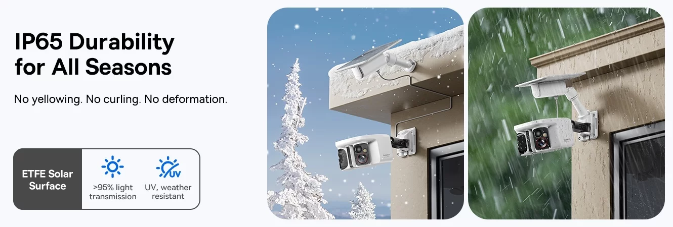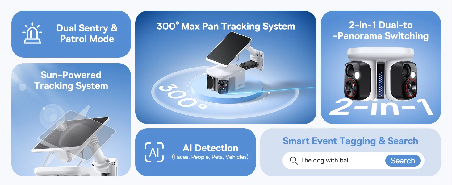 Unlike traditional single-lens security cameras that follow just one subject at a time, the X1 Pro stands out as the world’s first Smart AI Dual-Tracking Security Camera. It features two independent 3K cameras, each with a wide horizontal FOV 105-degree and 55-degree horizontal panning. Working together, they provide up to 300-degree of panoramic coverage, ensuring there are no blind spots around your property. Even better, both cameras can track two different areas or subjects simultaneously – be it the front yard and driveway, or the side gate and back porch – keeping your home fully covered without compromise.