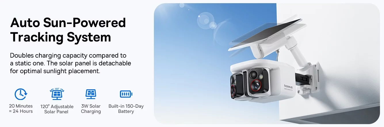 One of the biggest concerns with outdoor cameras is maintaining power. Baseus solves this elegantly with an auto sun-powered tracking system. Just 20 minutes of sunlight can keep the camera running 24/7, supported by a 120-degree adjustable solar panel and a 150-day built-in battery. That means continuous, worry-free operation without the need for constant charging or expensive wiring.