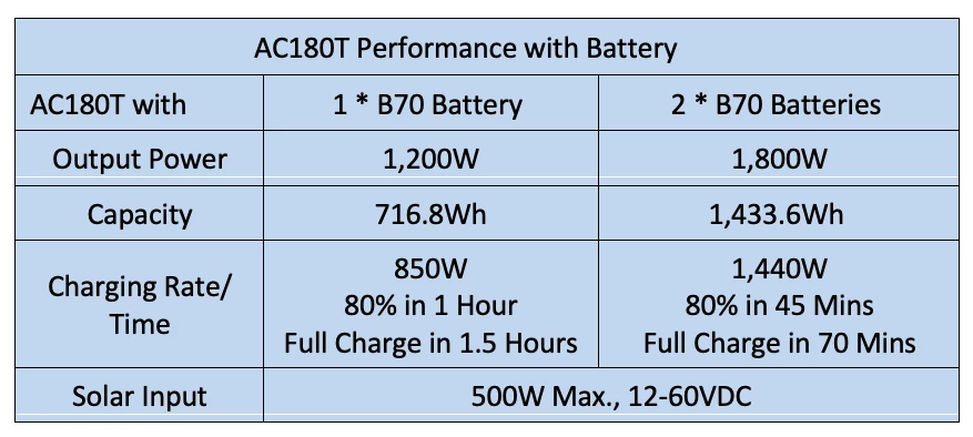 The AC180T introduces a removable battery design that allows you to replace its two B70 batteries (716.8 Wh) from the top. It uses long-lasting and safe LFP batteries with 3,000+ life cycles and 5,000+ swap times. Since BLUETTI also sells these batteries separately, you can choose multiple battery packs to suit your needs. For longer trips and emergencies, just swap them out for instant full power anytime, anywhere.