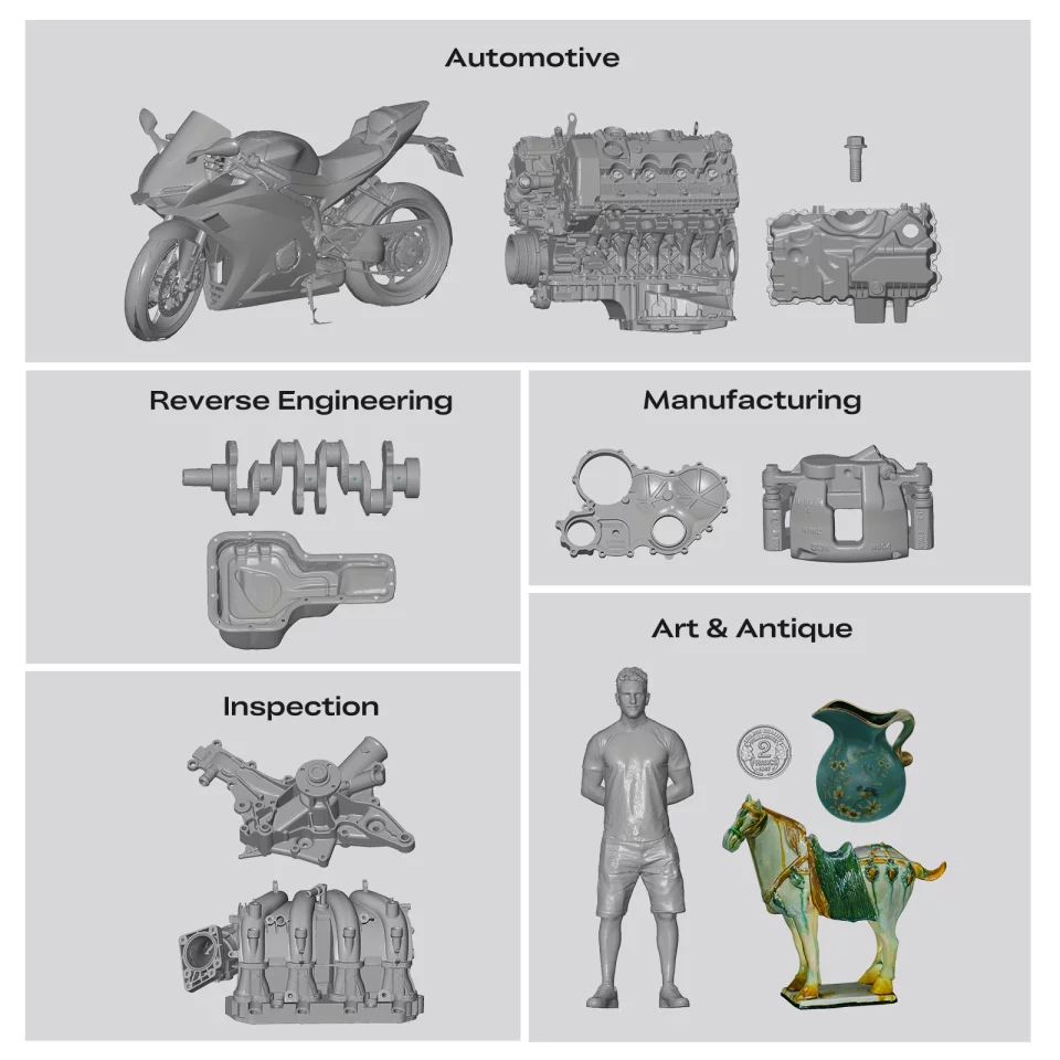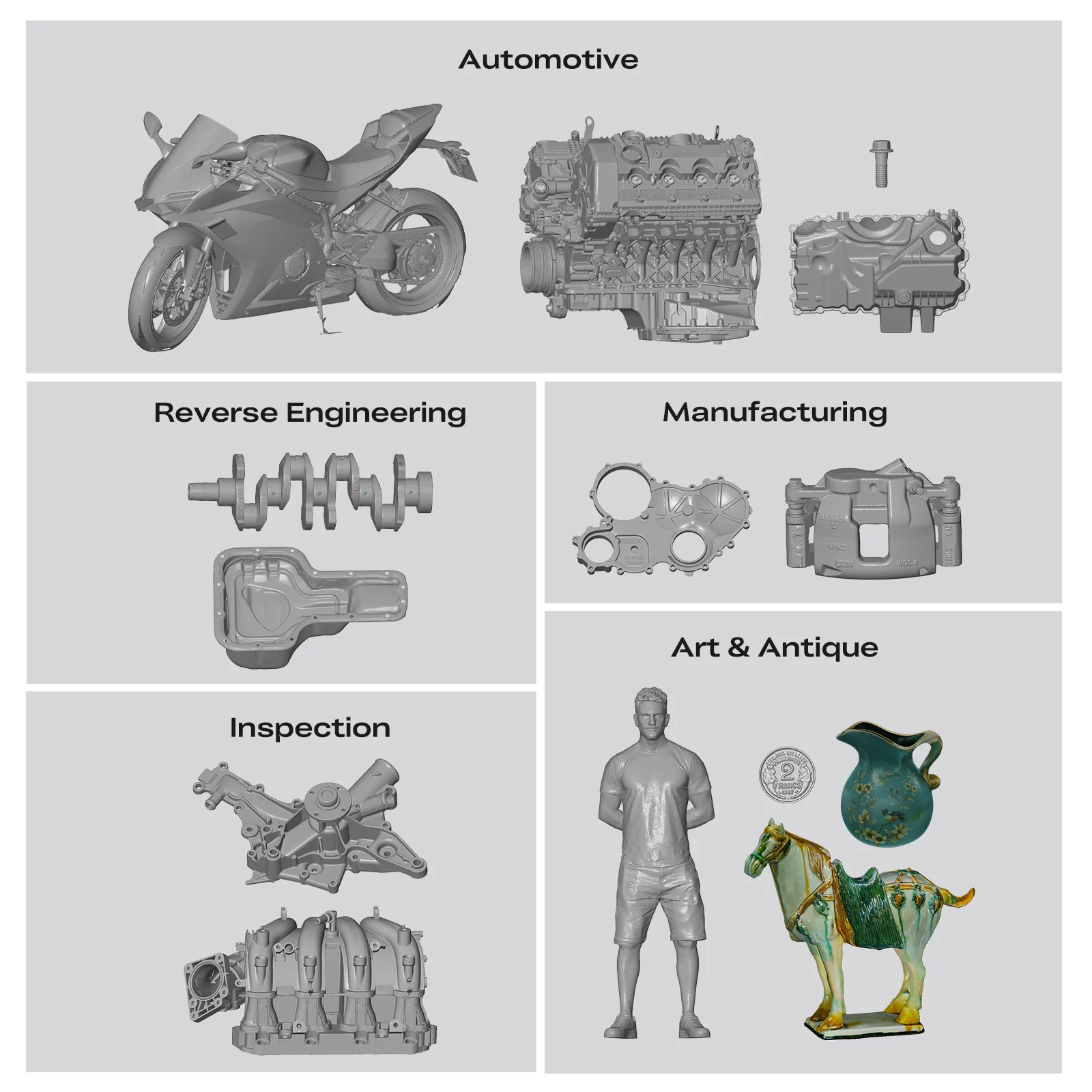 The S1’s wide scanning range – from 5 mm (0.2 in) micro-details to 4,000 mm (13 ft) large objects – makes it remarkably flexible. It’s suitable for reverse engineering parts, documenting prototypes, digitizing tools and machinery, capturing components for simulation, and integrating real-world objects into CAD or CAM systems. AI-assisted reconstruction tools and streamlined export options help reduce post-processing time and keep the focus on design and analysis rather than manual mesh cleanup.
